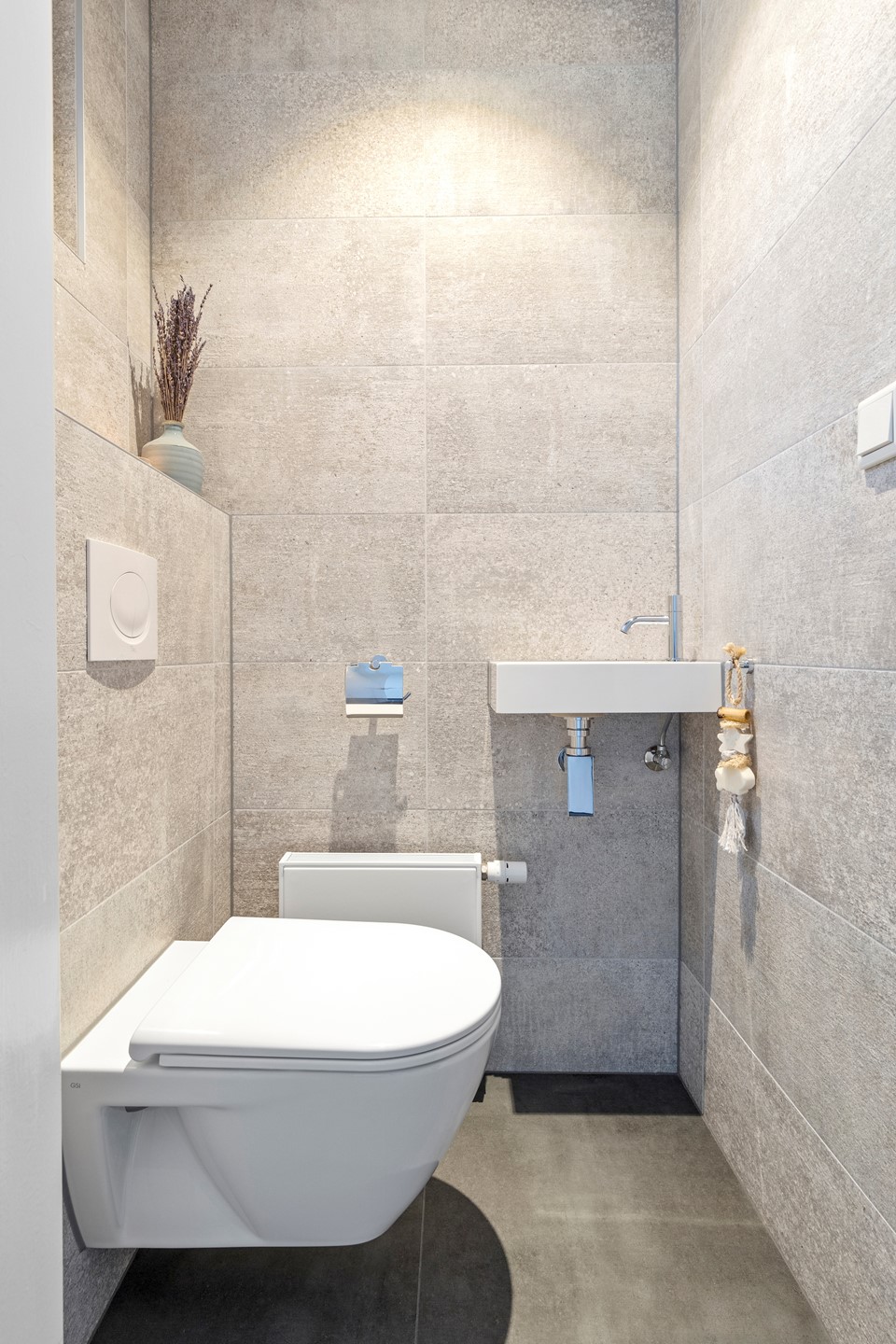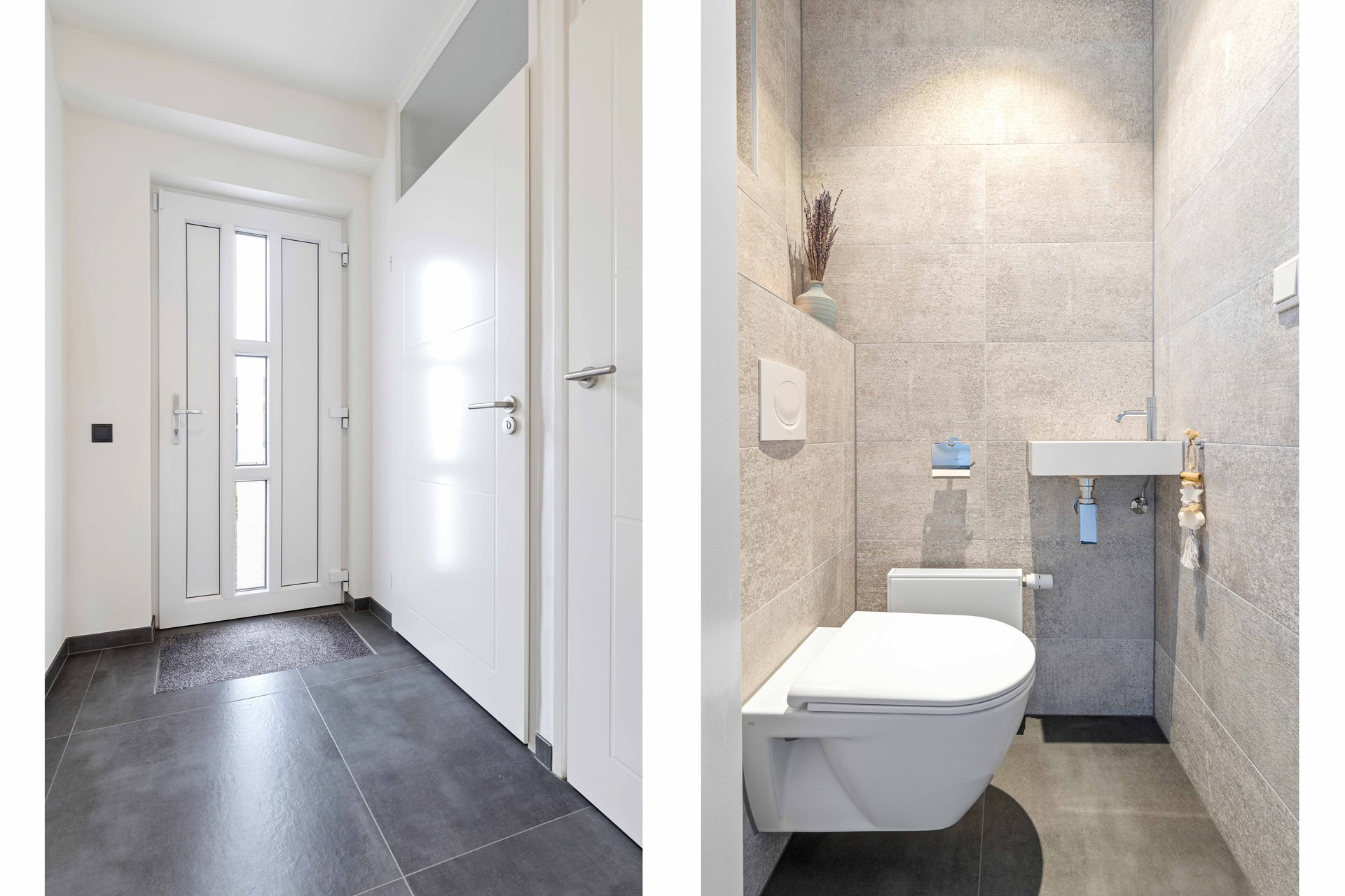 De entree is te bereiken via een beklinkerd looppad door de voortuin. De hal met garderobe geeft toegang tot de meterkast, toiletruimte, trappenhuis en woonkamer. De nieuwe geheel betegelde toiletruimte heeft een zwevend closet, fontein, radiator, plafondspots en ventilatievenster. De uitgebreide meterkast is deels vernieuwd.