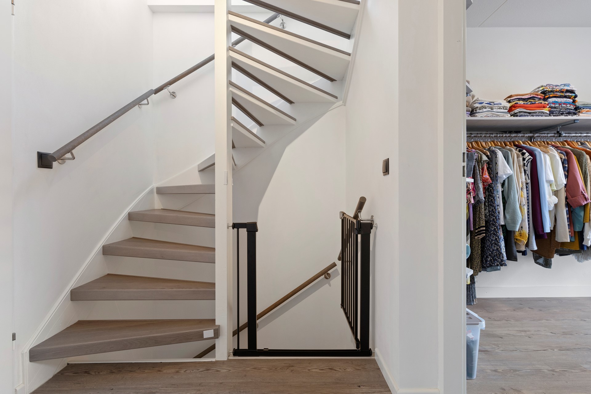 De gerenoveerde trapopgang met gedimde verlichting geeft toegang tot de overloop met 3 slaapkamers, de badkamer en de vaste trap naar de zolder.