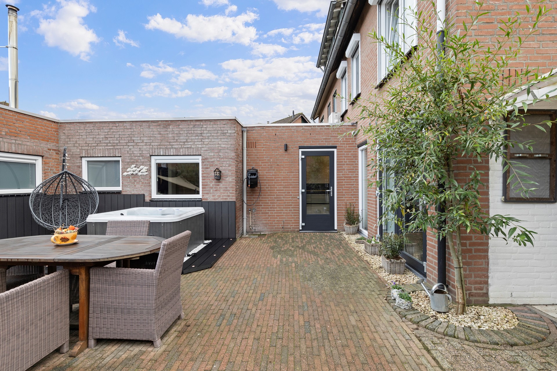 De tuin is gelegen rondom de woning en is onderhoudsvriendelijk ingericht met grijze kiezel, moderne bloembakken, groene omheining en een oprit aan de zijkant met poort naar de achtertuin. De speels ingerichte zonnige achtertuin heeft een ruim terras, een overdekt terras, een jacuzzi, water en elektra aansluiting en toegang tot de garage via een loopdeur. Aan de zijkant geeft een kleine schuur nog extra opbergmogelijkheid.