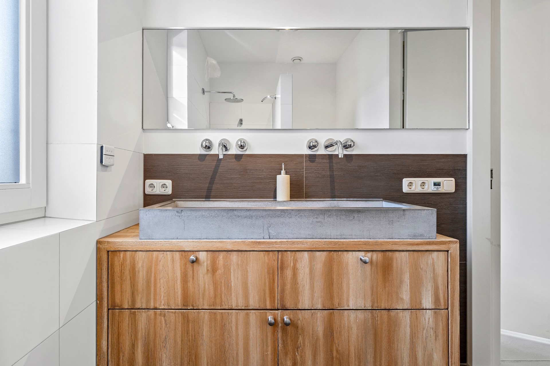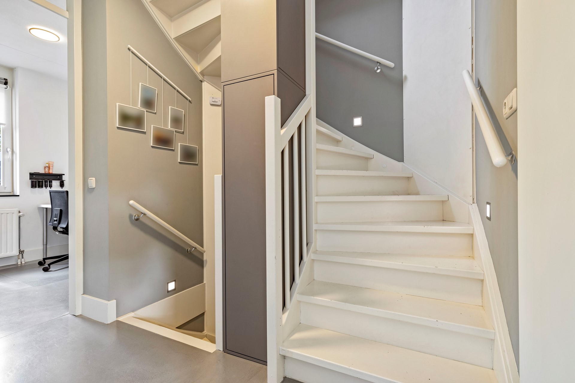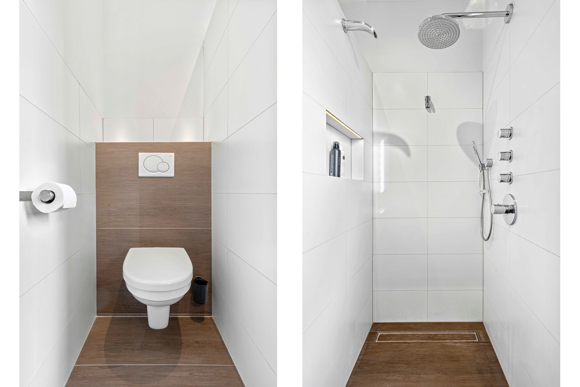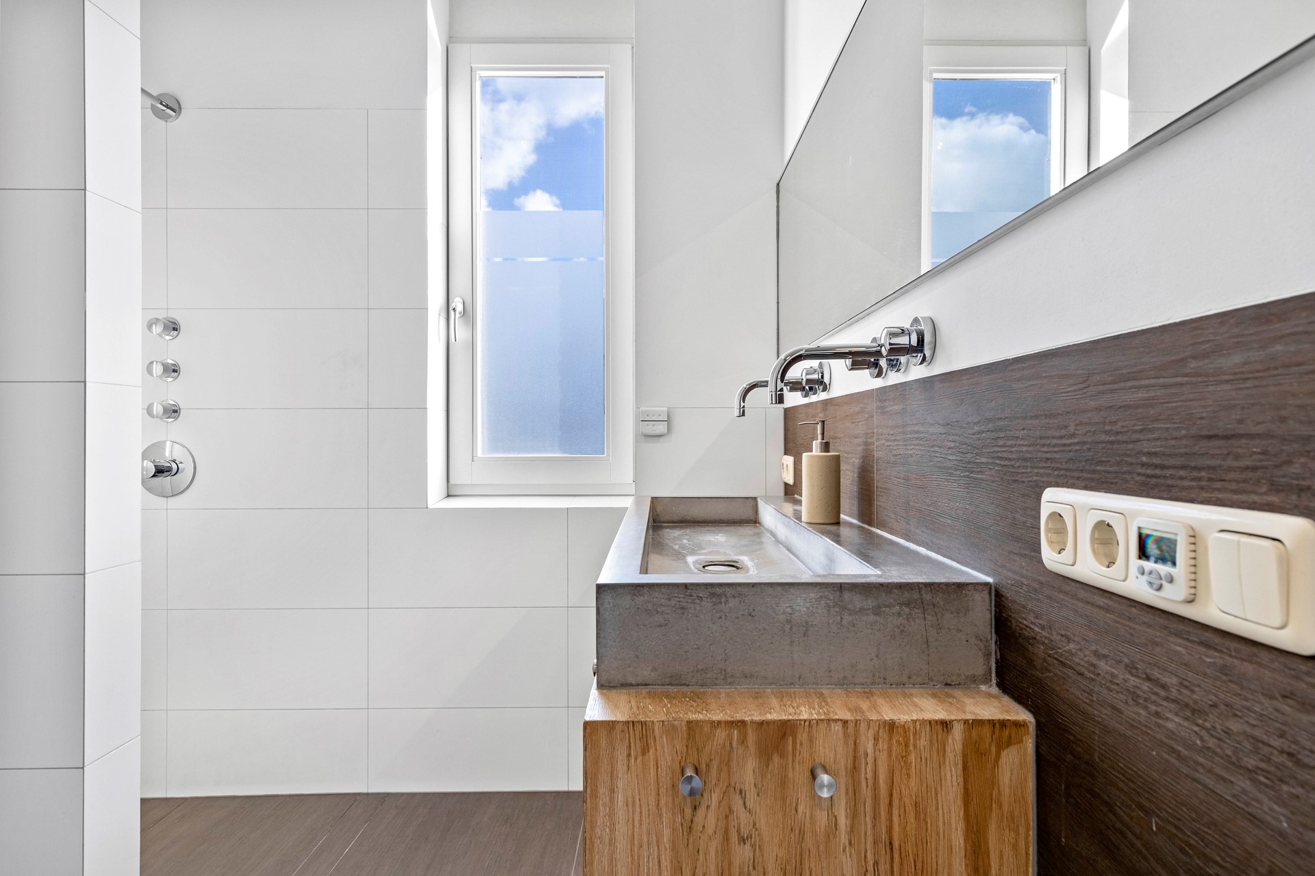 De trapopgang met verlichting geeft toegang tot de overloop van de 1e verdieping met daaraan grenzend 3 slaapkamers, de badkamer en de trapopgang naar de 2e verdieping. De slaapkamers zijn ca. 6,6m2, 8m2 en 11m2 groot. Eén slaapkamer is voorzien van een vaste inbouwkast. De moderne badkamer is ingericht met een inloopdouche, dubbele wastafel met betonnen waskom en een 2e zwevend closet. De gehele verdieping is voorzien van een strakke gietvloer. De slaapkamers zijn voorzien van elektrisch te bedienen rolluiken.