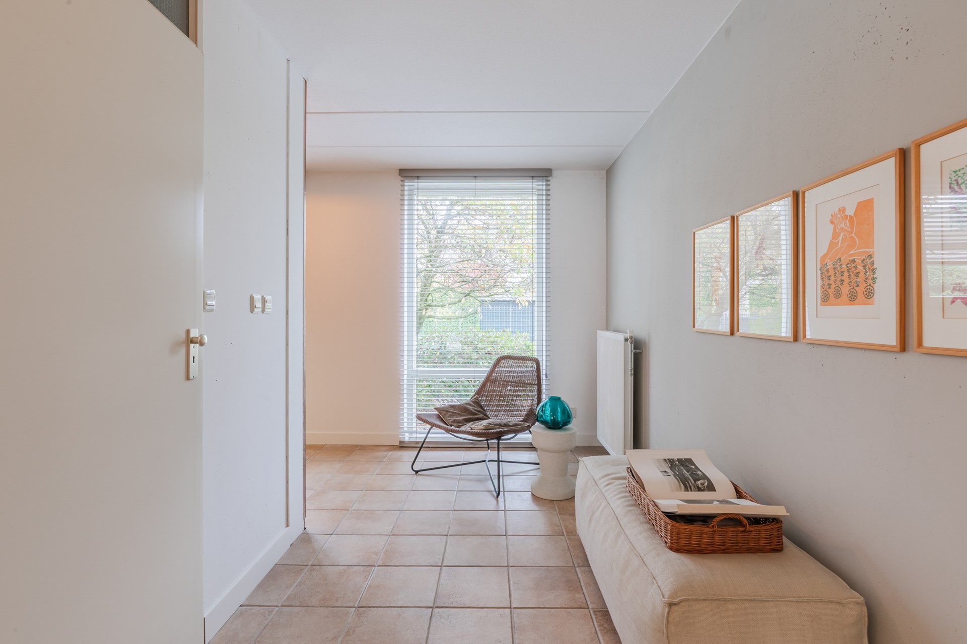 Vanuit de woonkamer is er toegang tot een portaal (ca. 5,5m2)met toegang tot de garage, de badkamer, de slaapkamer op de begane grond en de deur naar de tuin.