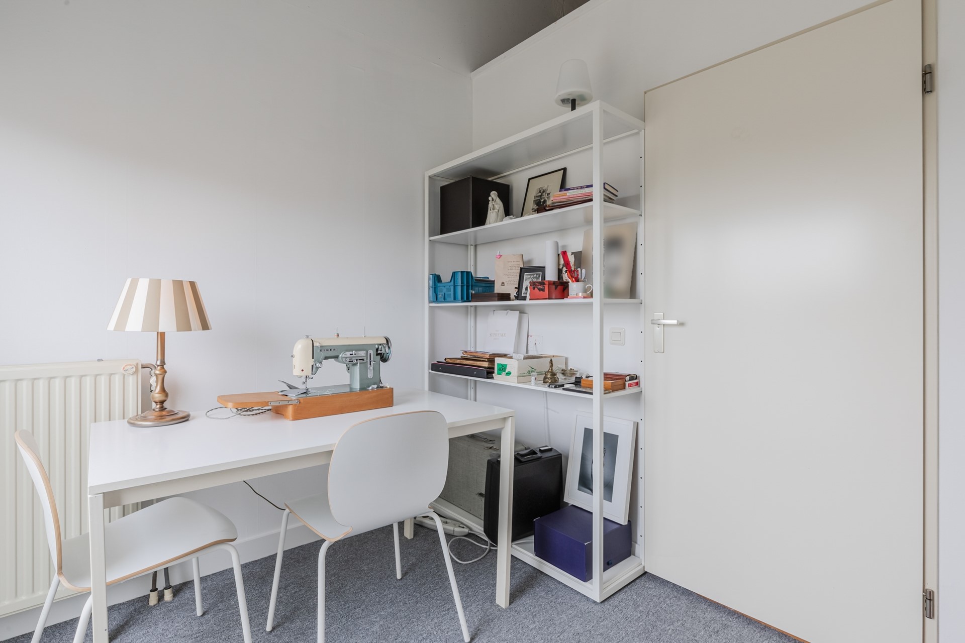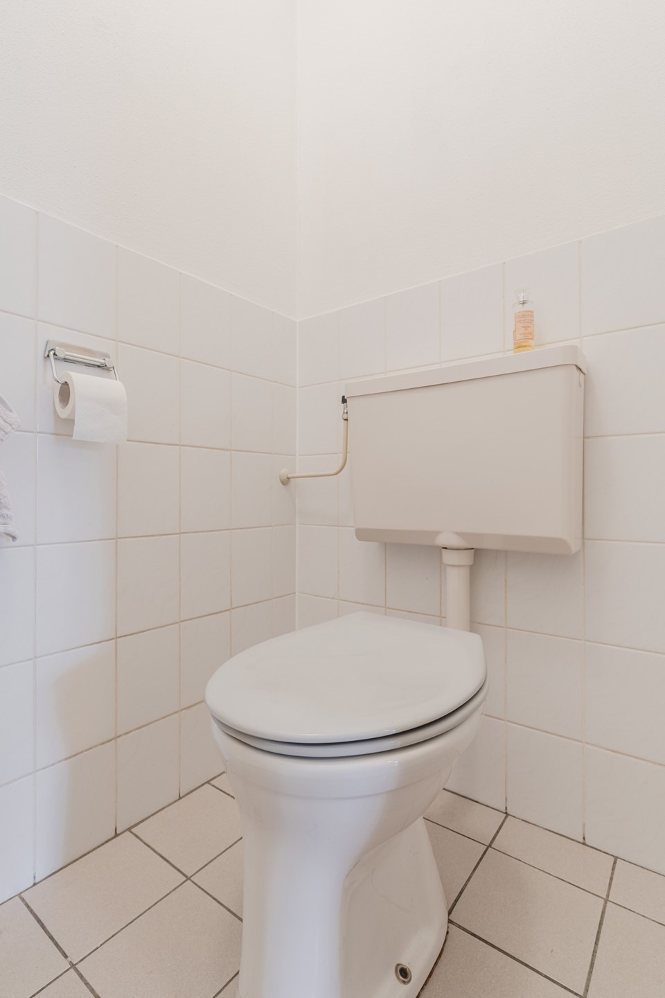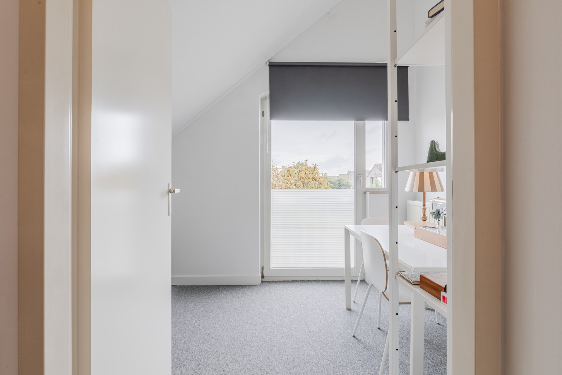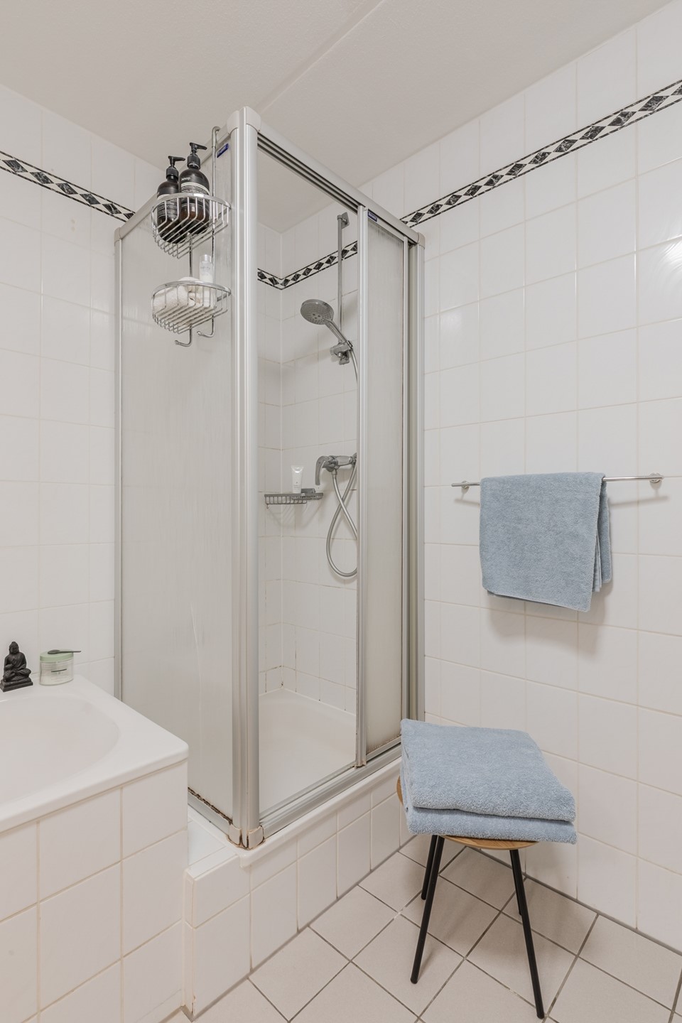 De ruime lichte slaapkamer (ca. 17m2) grenst aan de tuin en heeft een grote vaste schuifkastenwand met inrichting. De slaapkamer is voorzien van rolluiken aan de buitenzijde. De grote geheel betegelde