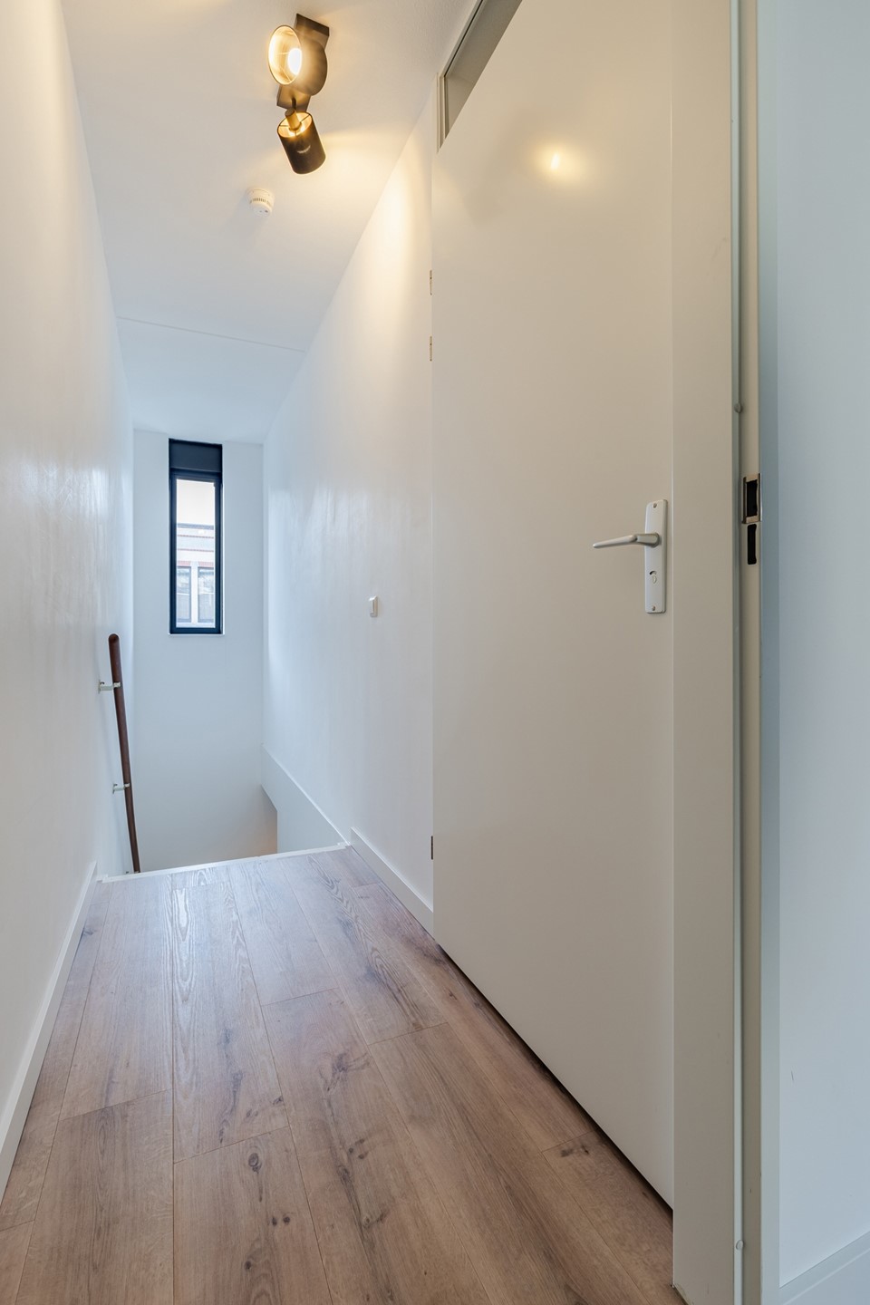 De overloop geeft toegang tot de royale slaapkamer (ca. 16m2), de badkamer (ca. 7m2), wasruimte en dakterras. De ruime slaapkamer is voorzien van vensters, TV-aansluiting, en ruimte voor een groot bed en grote kast. De geheel betegelde badkamer is ingericht met inloopdouche, thermostaatkraan, zwevend closet, grote wastafel met ladekast, spiegel en designradiator. De wasruimte met aansluitingen voor de wasmachine en droger. in de wasruimte bevindt zich ook de