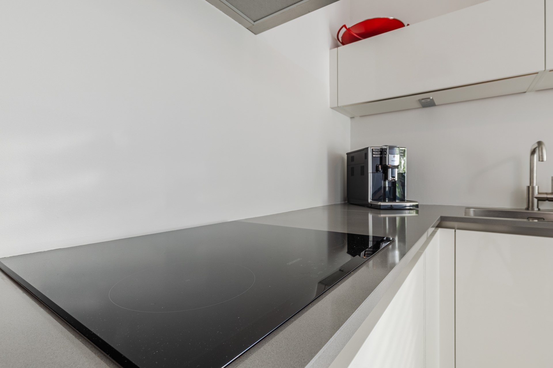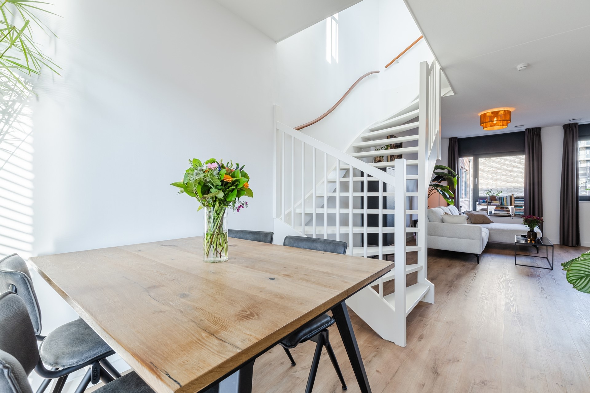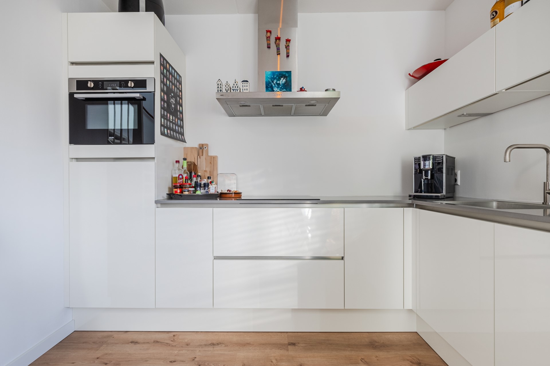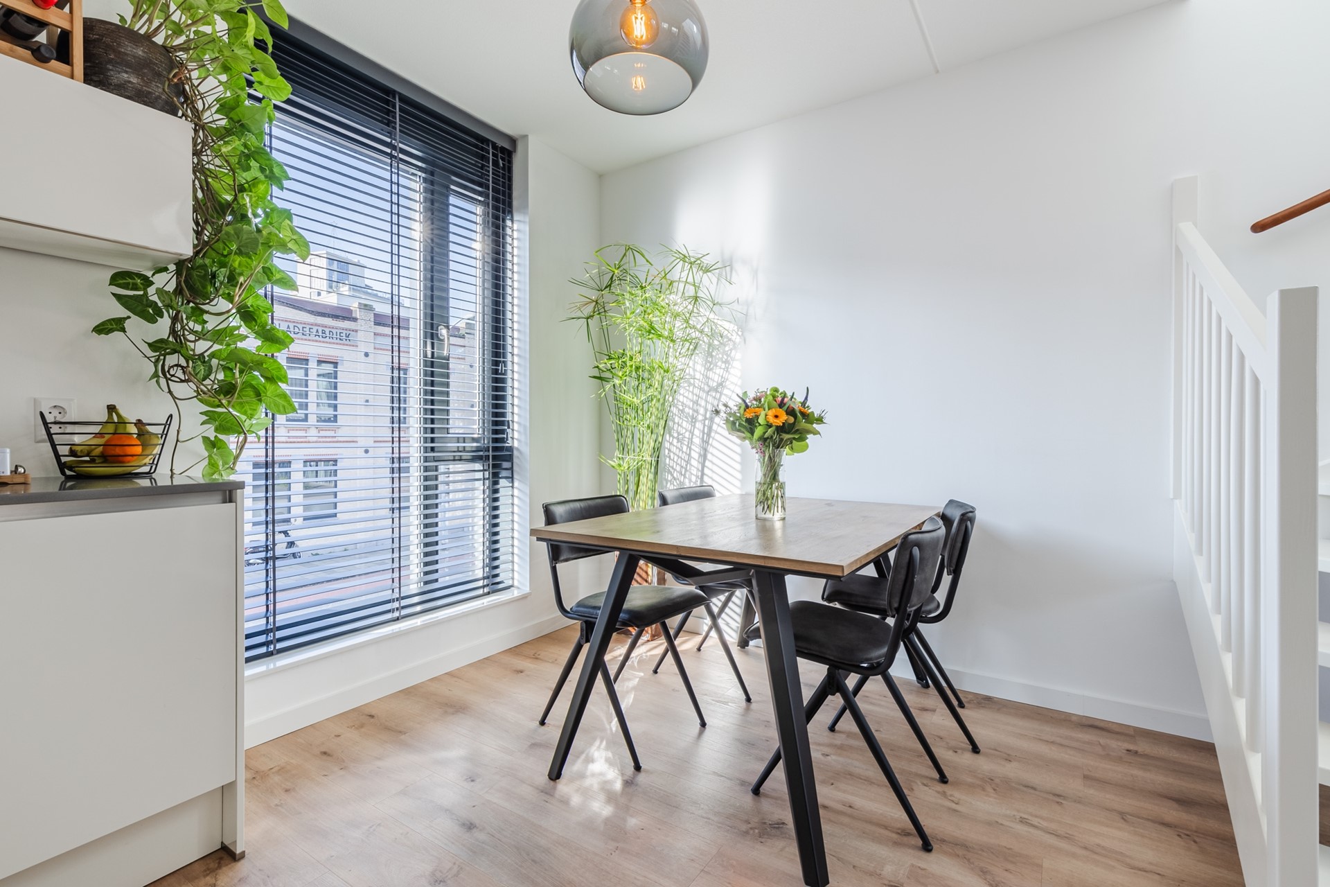 Via het mooie lichte trappenhuis met daglichtvenster komt men in de woonkamer op de 1e verdieping. In het trappenhuis bevindt zich de deels betegelde toiletruimte met zwevend closet en fontein. De gezellige woonkamer (ca. 26m2) heeft een comfortabele ruime zithoek aan de achterzijde. Via de woonkamer loopt men door naar de deels afgescheiden keuken aan de voorzijde. De woonkamer en keuken zijn gescheiden door een open trapopgang. De compleet ingerichte moderne keuken in hoekopstelling is voorzien van een inductie kookplaat met afzuigkap, koelkast, combi oven-magnetron, vaatwasser, composieten werkblad en voldoende opbergruimte. De keuken heeft een oppervlakte van ca. 12m2. Aan de voorzijde is er uitzicht op de voormalige chocoladefabriek wat zorgt voor een industrieel karakter. De woonlaag heeft grote vensters met veel lichtinval. De hele verdieping is voorzien van een PVC-vloer met vloerverwarming.