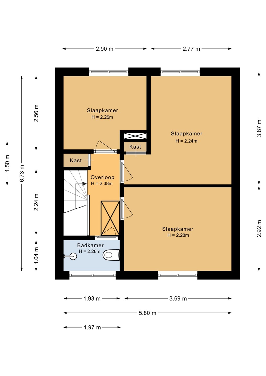 Middels de beklede trapopgang is de overloop te bereiken. De overloop voorzien van de airco-unit geeft toegang tot 3 slaapkamers en de badkamer. De slaapkamers zijn voorzien van ca. 7,5m2, 11m2 en 12m2 groot en allen voorzien van een laminaatvloer en rolluiken. De badkamer heeft een inloopdouche en een wastafel met meubel en spiegelkast.