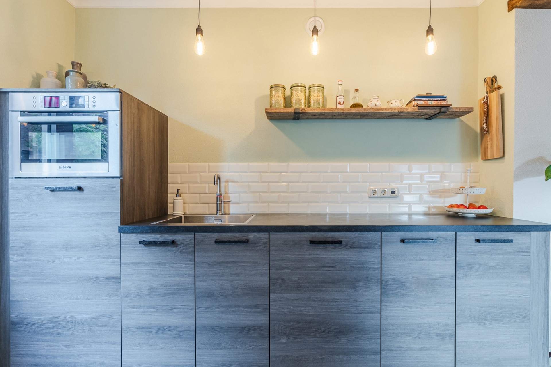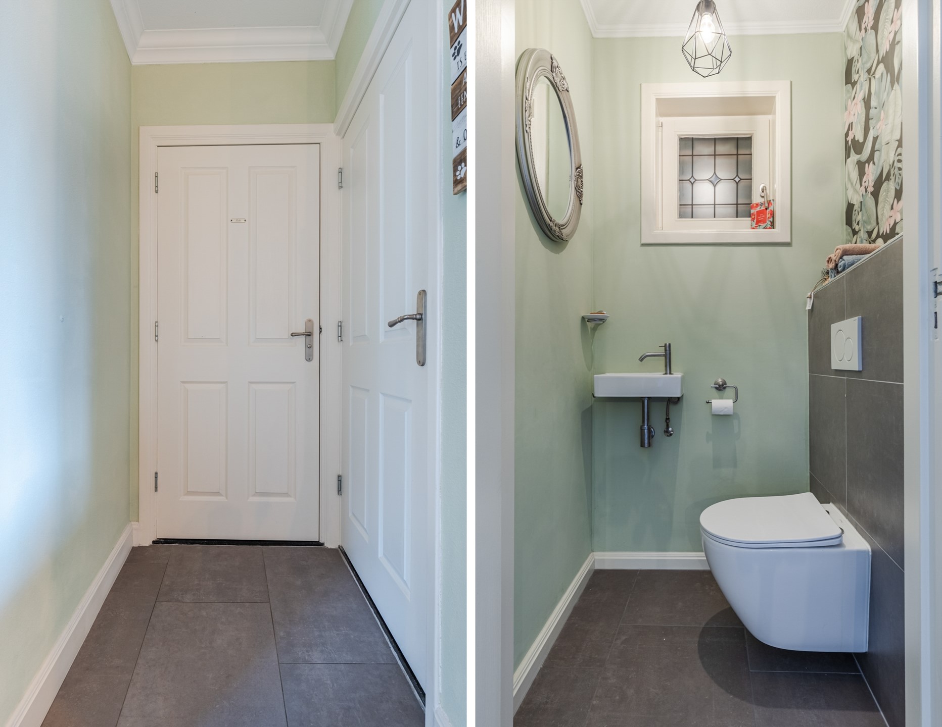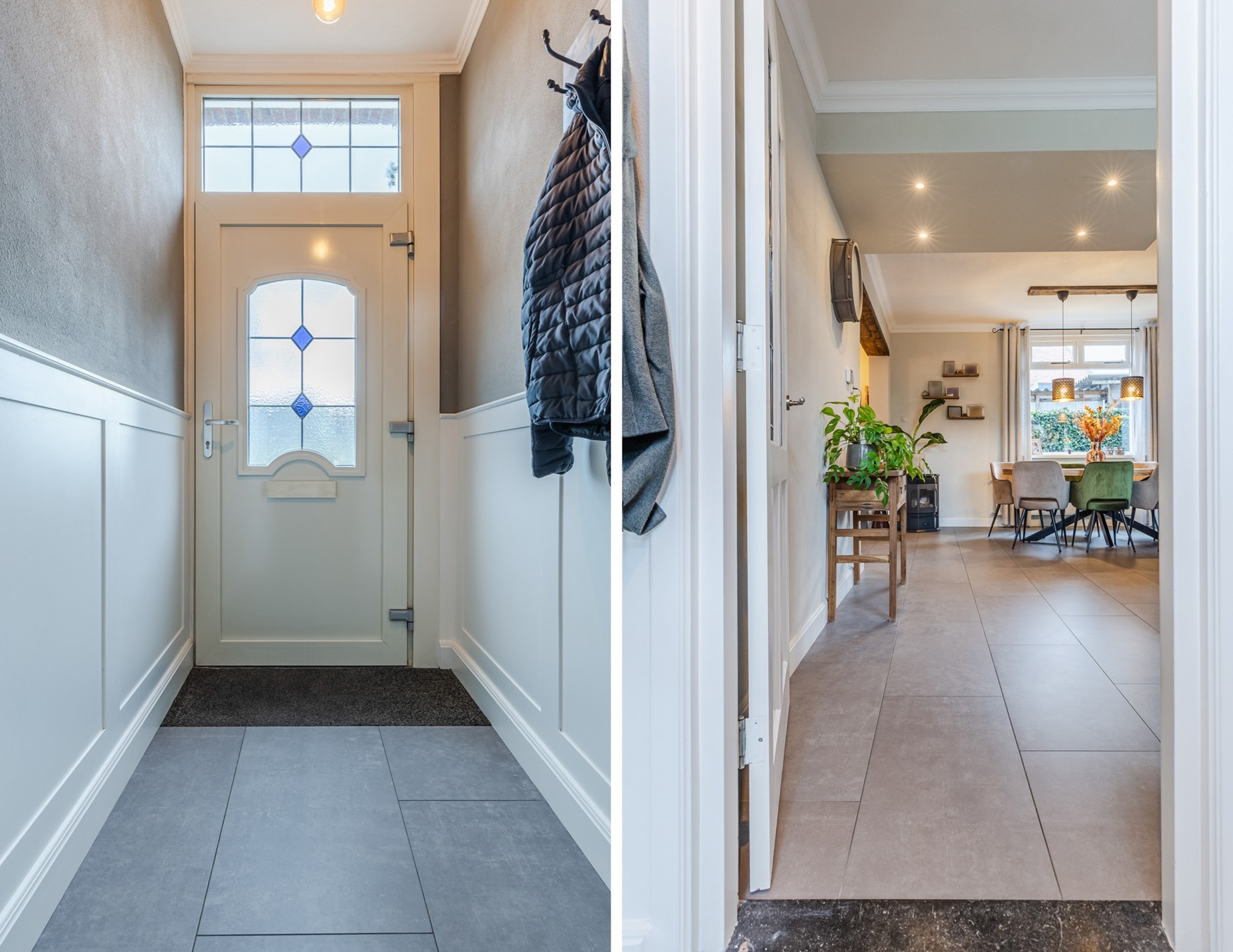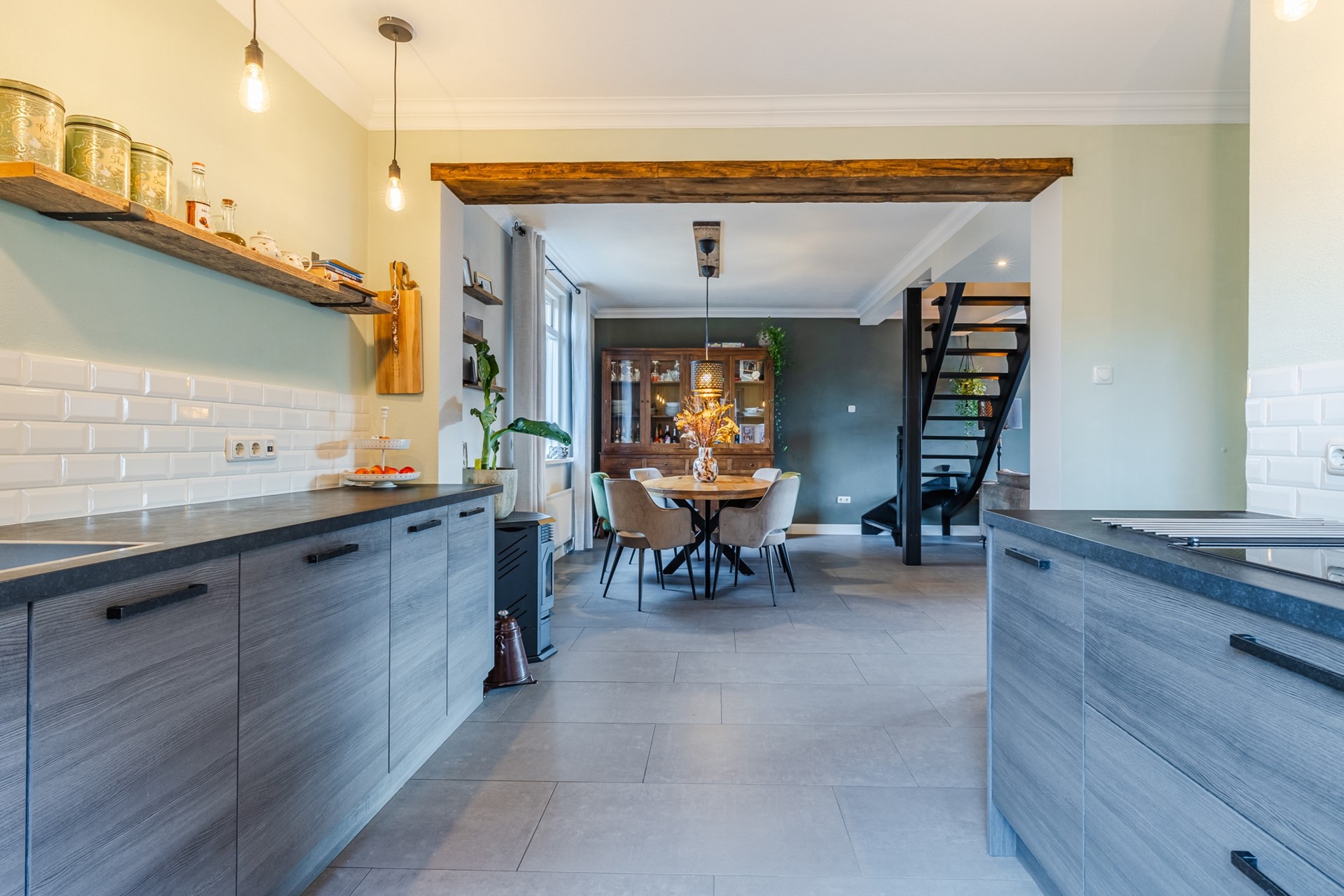 Entree/ hal met garderobe en toegang tot de woonkamer. De gehele begane grond is voorzien van een tegelvloer met vloerverwarming. De ruime woonkamer (ca. 36m2) is voorzien van strak gestuukte wanden, inbouwspots en mooie sierlijsten en ornamenten. Verder heeft de woonkamer een pelletkachel (ter overname). Aan de voorzijde heeft het raam glas-in-loodramen. De open keuken (2021) is ingericht met een inductiekookplaat met kookveldafzuiging, combi-oven, koelkast, vaatwasser en een Quooker. De keuken is ca. 9m2 groot. Middels een loopdeur is er toegang tot de tuin. Een open hal geeft toegang tot de toiletruimte en de wasruimte. De toiletruimte is voorzien van een zwevend closet en fonteintje. De wasruimte is voorzien van de witgoedaansluitingen. Tevens is hier de combi CV-ketel gesitueerd (Atag 2016).