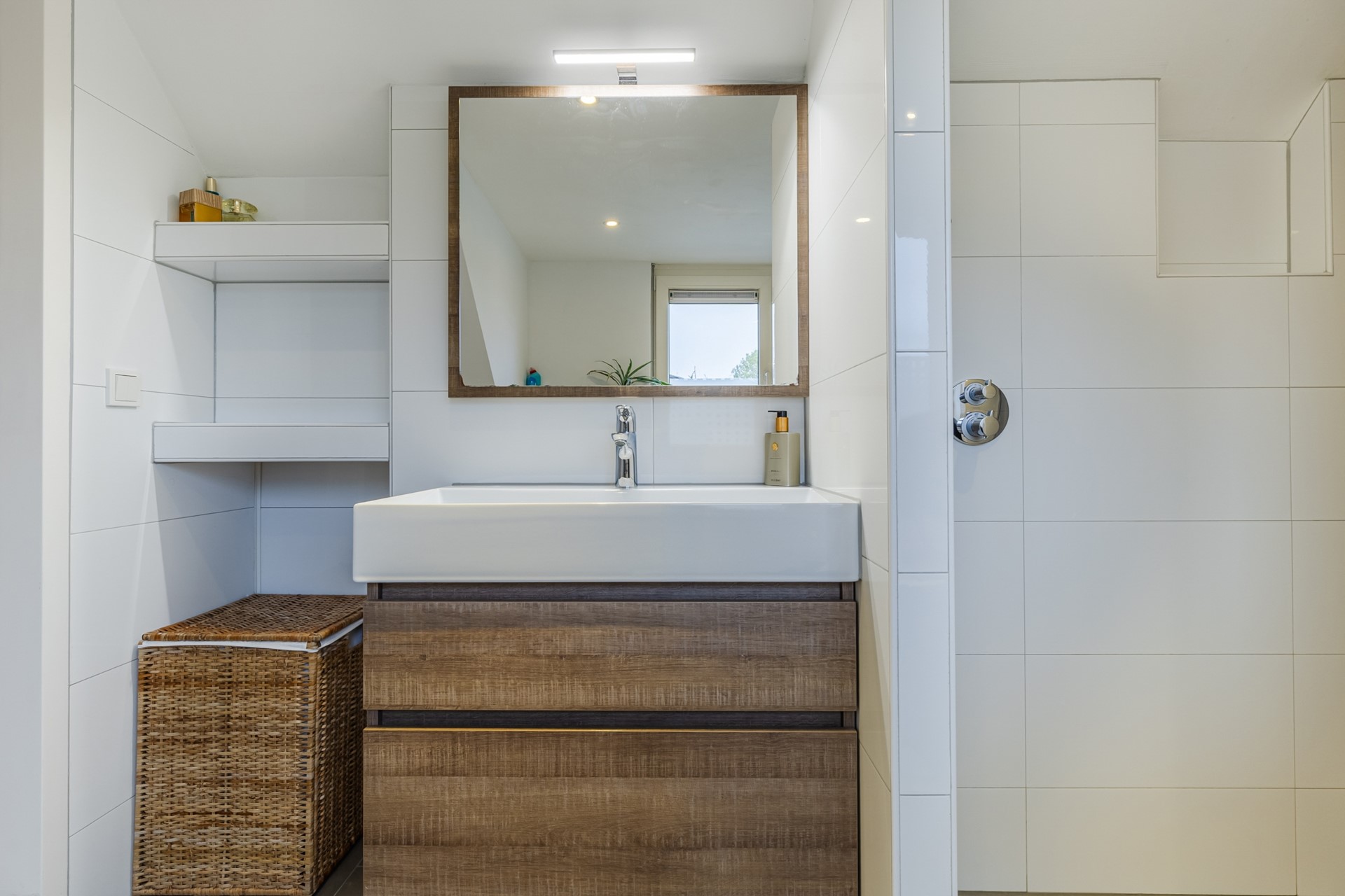 De overloop geeft toegang tot 3 slaapkamers, een muurkast, een badkamer en de vaste trapopgang naar de 2e verdieping. De overloop en de slaapkamers zijn voorzien van een laminaatvloer. De slaapkamers zijn ca. 5m2, 11m2 en 14m2 groot. De badkamer is ingericht met een ligbad, inloopdouche, zwevend toilet en een wastafel met meubel. De badkamer is voorzien van vloerverwarming. De 1e verdieping is voorzien van airconditioning (2019).