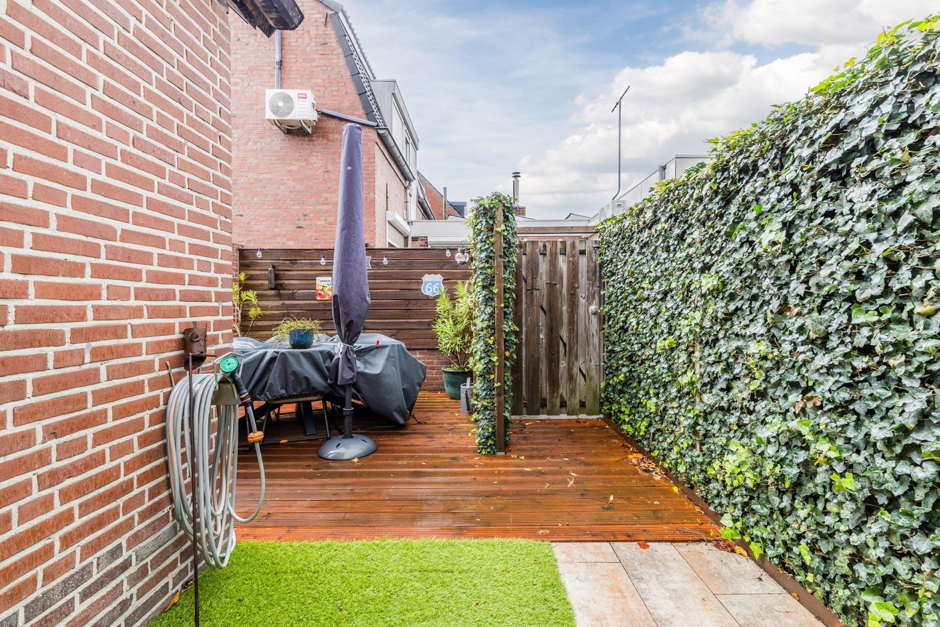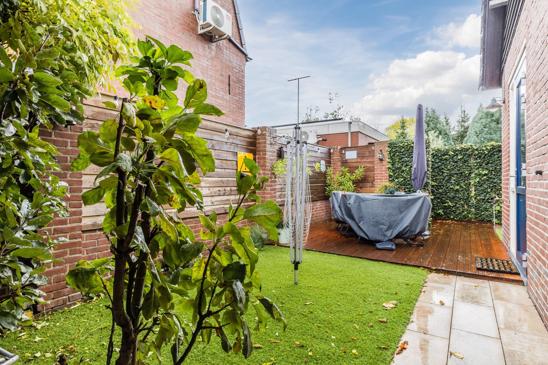 De tuin is voornamelijk aan de zijkant van de woning gelegen en is onderhoudsvriendelijk aangelegd met een groot vlonderterras, kunstgras en bestrating. In de tuin bevindt zich een overkapping (9m2). Vanuit de tuin is er toegang tot de berging (ca. 8m2). De tuin is te bereiken middels een achterom en is gelegen op het zuidoosten.