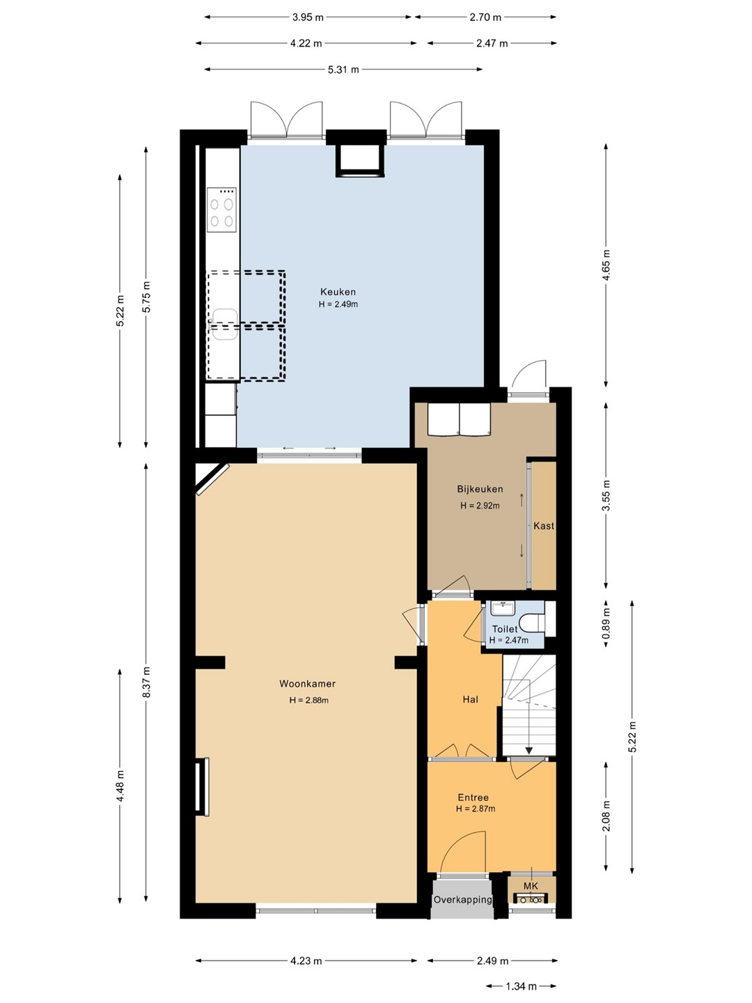 De hal biedt toegang tot de woonkamer, bijkeuken en moderne toiletruimte met zwevend closet en fonteintje. De ruime bijkeuken (ca. 9 m²) beschikt over een vaste kastenwand en biedt toegang tot de tuin.