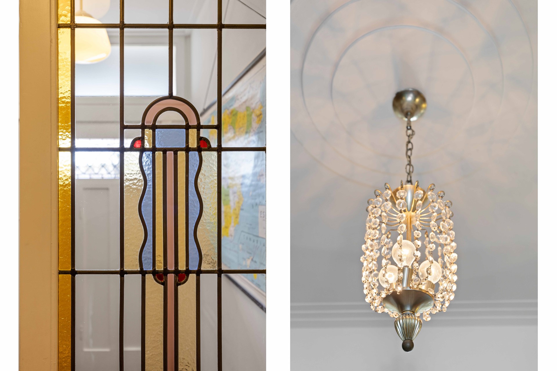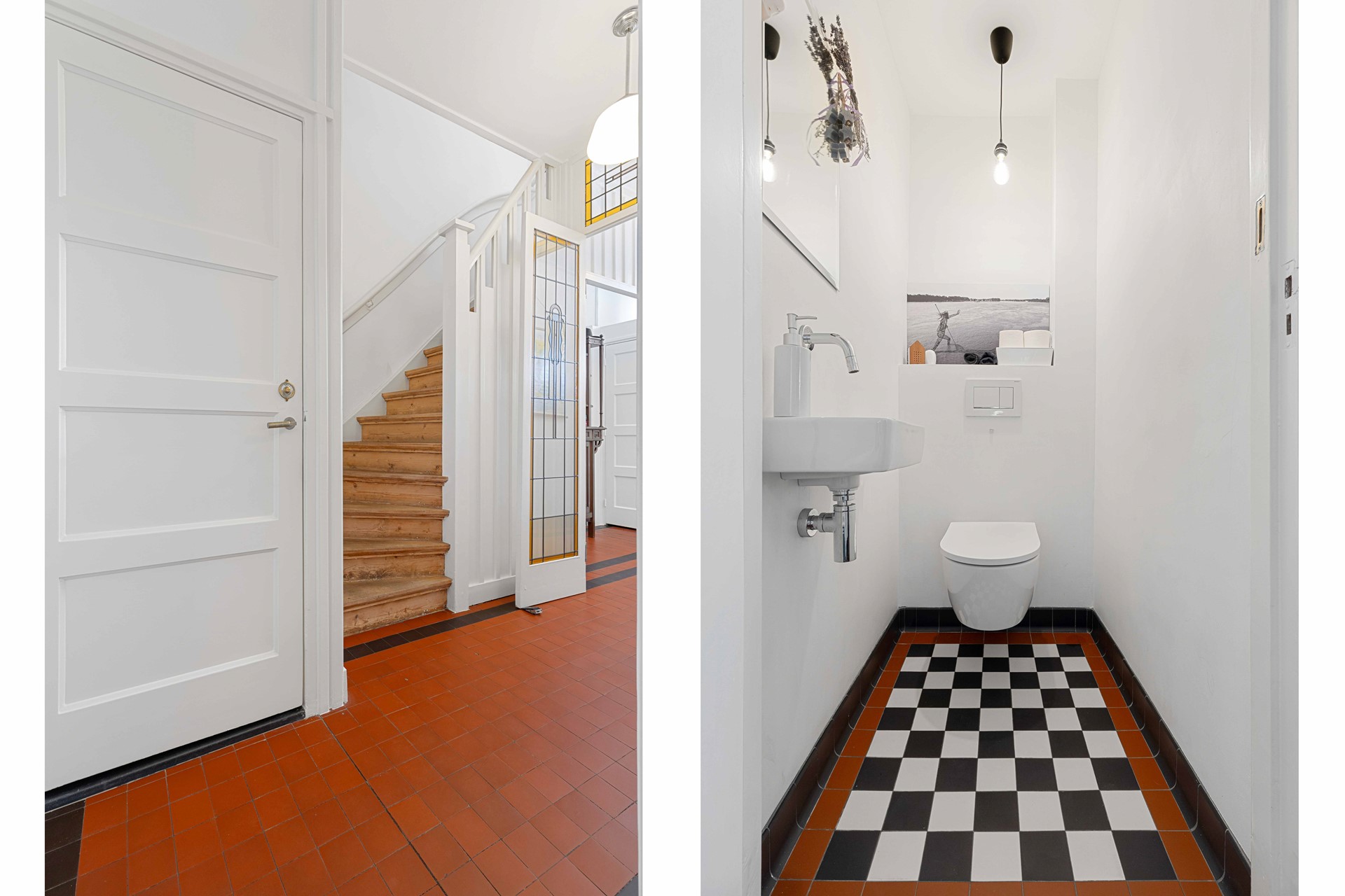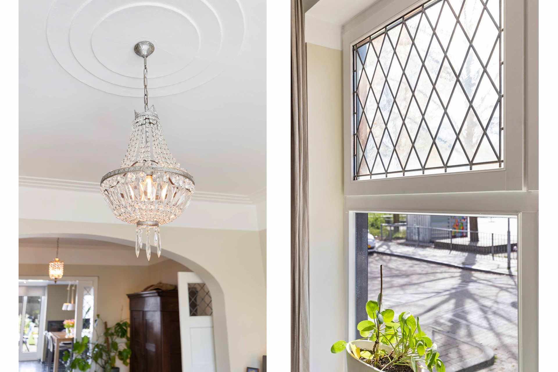 Via de karakteristieke jaren ’30 portiek bereikt u het voorportaal met meterkast/garderobe en toegang tot de kelder. Dubbele taatsdeuren met glas-in-lood geven toegang tot de statige hal met originele trapopgang.