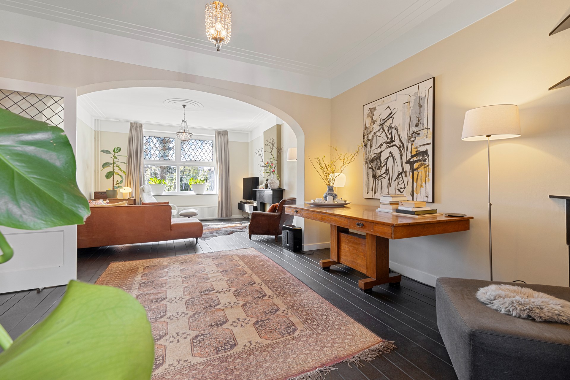 De royale woonkamer (ca. 35 m²) heeft een sfeervolle zithoek aan de voorzijde met groot glas-in-loodraam en is afgewerkt met een massieve eikenhouten vloer en strak gestucte wanden en plafonds.