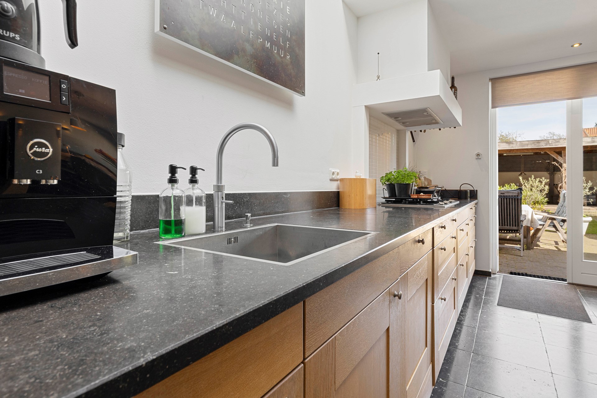 De keukenopstelling met massief houten kasten en natuurstenen werkblad is uitgerust met hoogwaardige inbouwapparatuur, waaronder een oven, combi-oven/magnetron, vaatwasser, 5-pits fornuis met wokbrander, afzuigkap en Quooker. De natuurstenen vloer is voorzien van vloerverwarming.