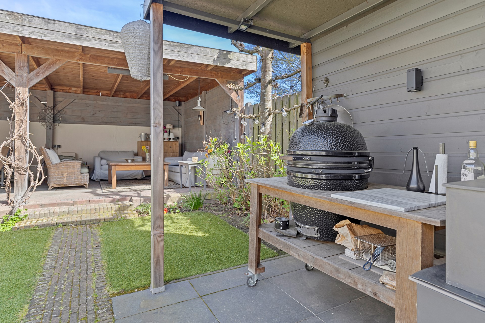 De zonnige achtertuin is sfeervol aangelegd en biedt veel privacy. Direct aan de woning ligt een terras, gevolgd door een onderhoudsvrij gazon. Achterin de tuin bevindt zich een ruime houten overkapping over de volle breedte (ca. 29 m²), voorzien van elektra en verlichting. Daarnaast zijn er een tuinhuis en een overdekte buitenruimte voor een buitenkeuken.