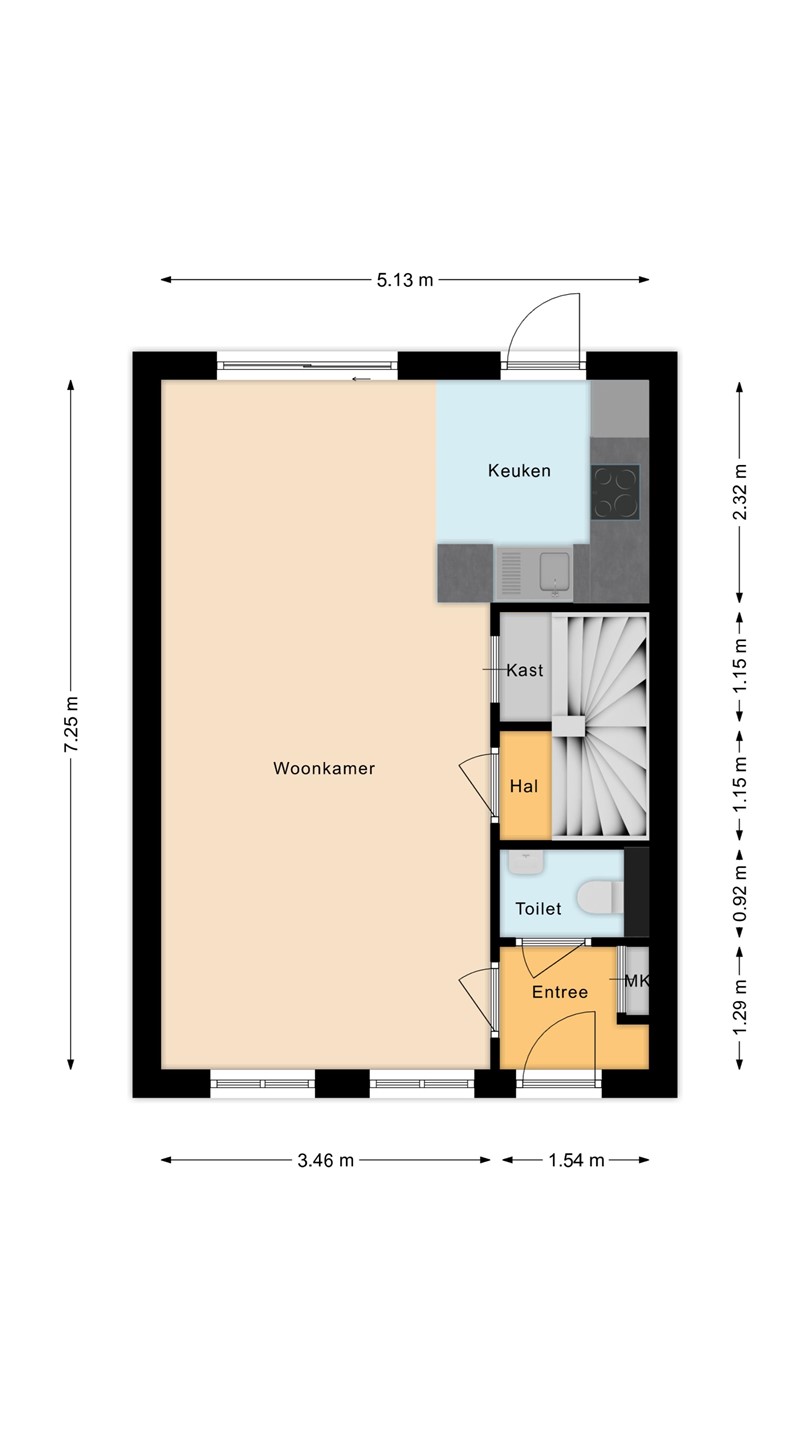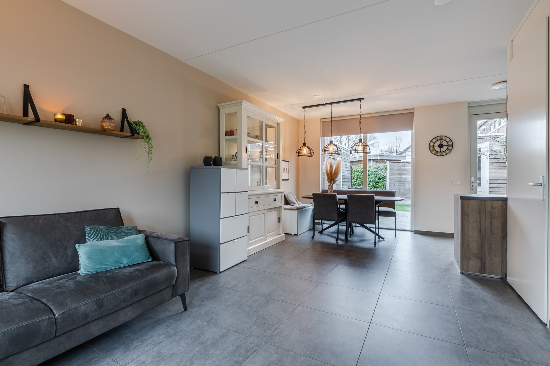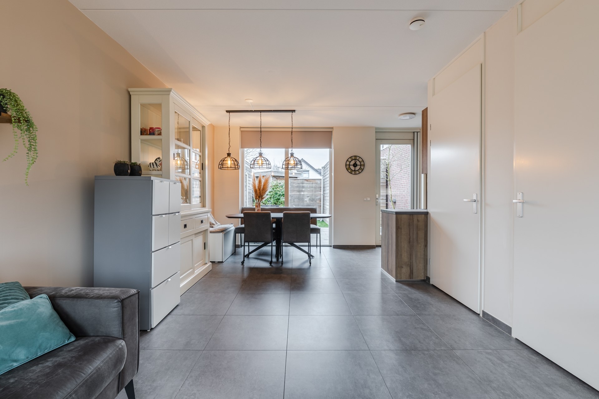 Middels een looppad door de voortuin is de entree tot de woning te bereiken. De entree/ hal geeft toegang tot de meterkast, de toiletruimte en de woonkamer. De gehele begane grond is voorzien van een grote grijze tegel met vloerverwarming. De toiletruimte heeft een zwevend closet en fonteintje. De woonkamer is ca. 29m2 groot. Aan de achterzijde is de semi-open keuken gesitueerd. De keuken is ingericht met een inductiekookplaat, afzuigkap, heteluchtoven, vaatwasser en koelkast. Middels een loopdeur is er toegang tot de tuin. Vanuit de woonkamer is er verder toegang tot de trapkast en een portaal met trapopgang naar de 1e verdieping.