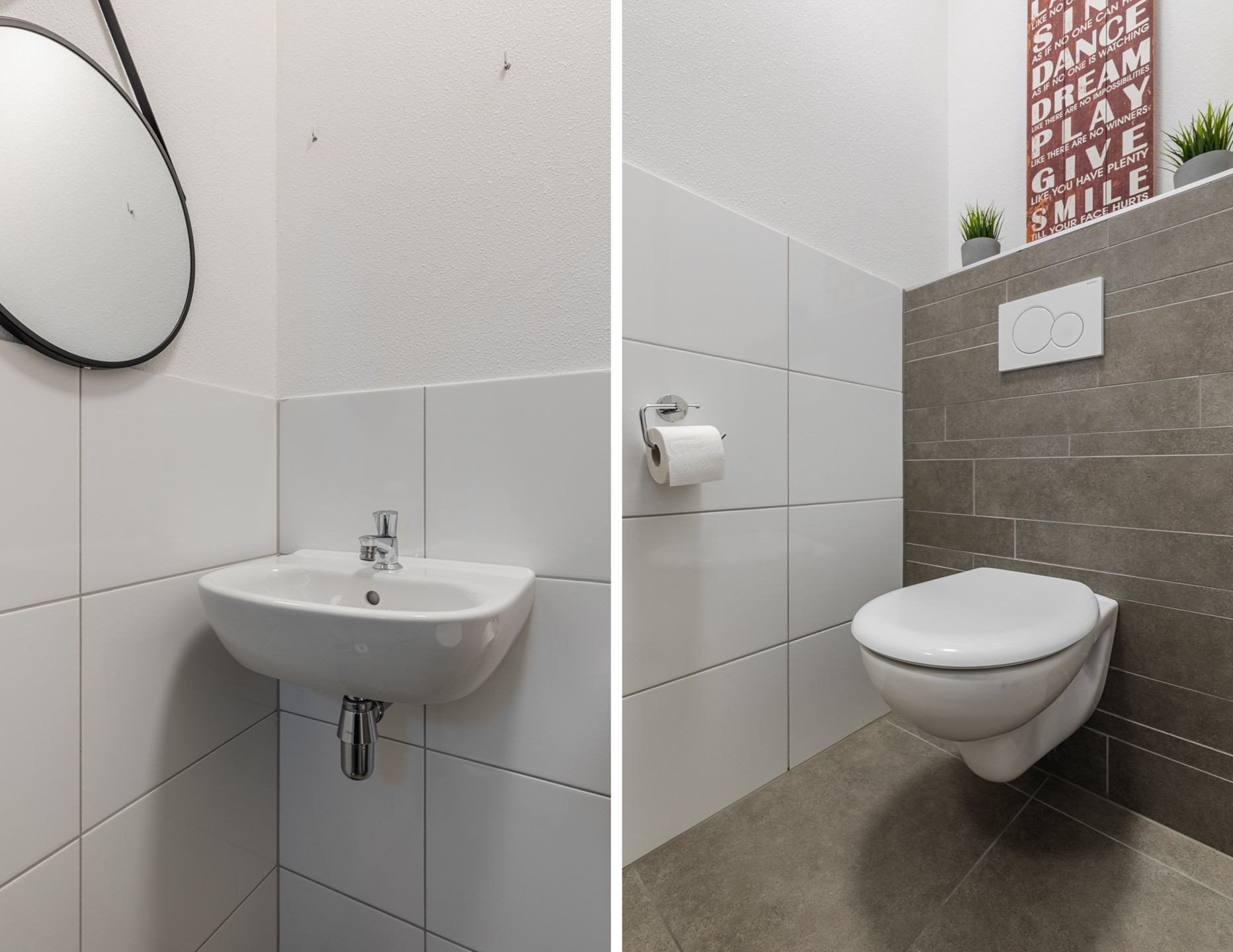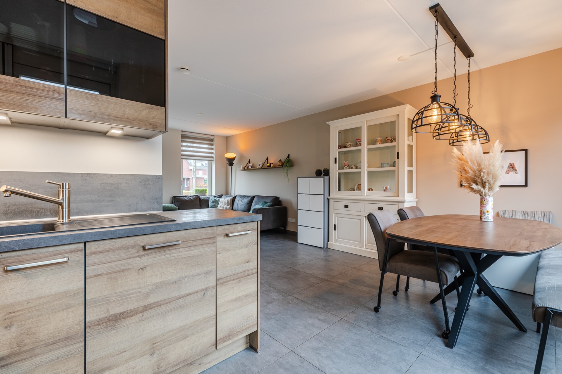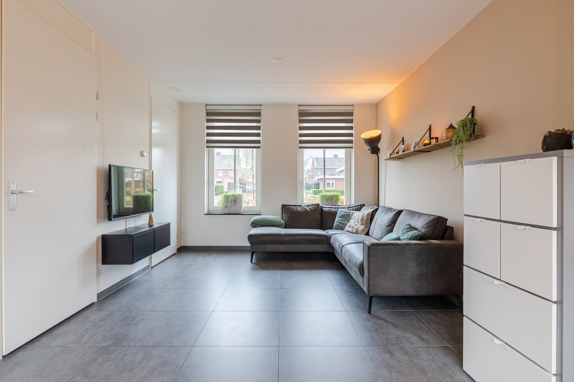 Middels een looppad door de voortuin is de entree tot de woning te bereiken. De entree/ hal geeft toegang tot de meterkast, de toiletruimte en de woonkamer. De gehele begane grond is voorzien van een grote grijze tegel met vloerverwarming. De toiletruimte heeft een zwevend closet en fonteintje. De woonkamer is ca. 29m2 groot. Aan de achterzijde is de semi-open keuken gesitueerd. De keuken is ingericht met een inductiekookplaat, afzuigkap, heteluchtoven, vaatwasser en koelkast. Middels een loopdeur is er toegang tot de tuin. Vanuit de woonkamer is er verder toegang tot de trapkast en een portaal met trapopgang naar de 1e verdieping.