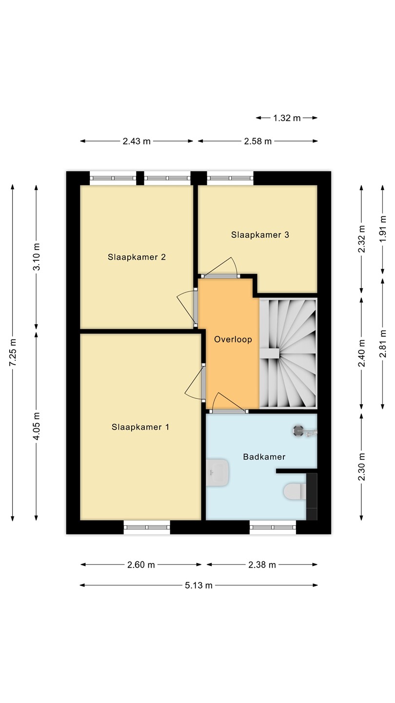 De overloop geeft toegang tot 3 slaapkamers, de badkamer en de vaste trap naar de 2e verdieping. De overloop en de slaapkamers zijn voorzien van een laminaatvloer. De slaapkamers zijn ca. 6m2, 7,5m2 en 11m2 groot. De badkamer is ingericht met een zeer ruime inloopdouche, een brede wastafel met meubel en een 2e toilet. De gehele 1e verdieping is voorzien van vloerverwarming, rolluiken en airco (2020).