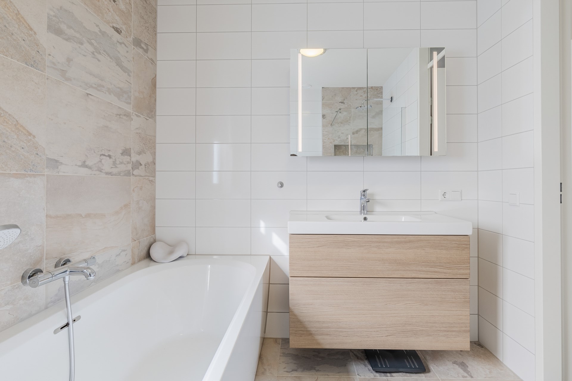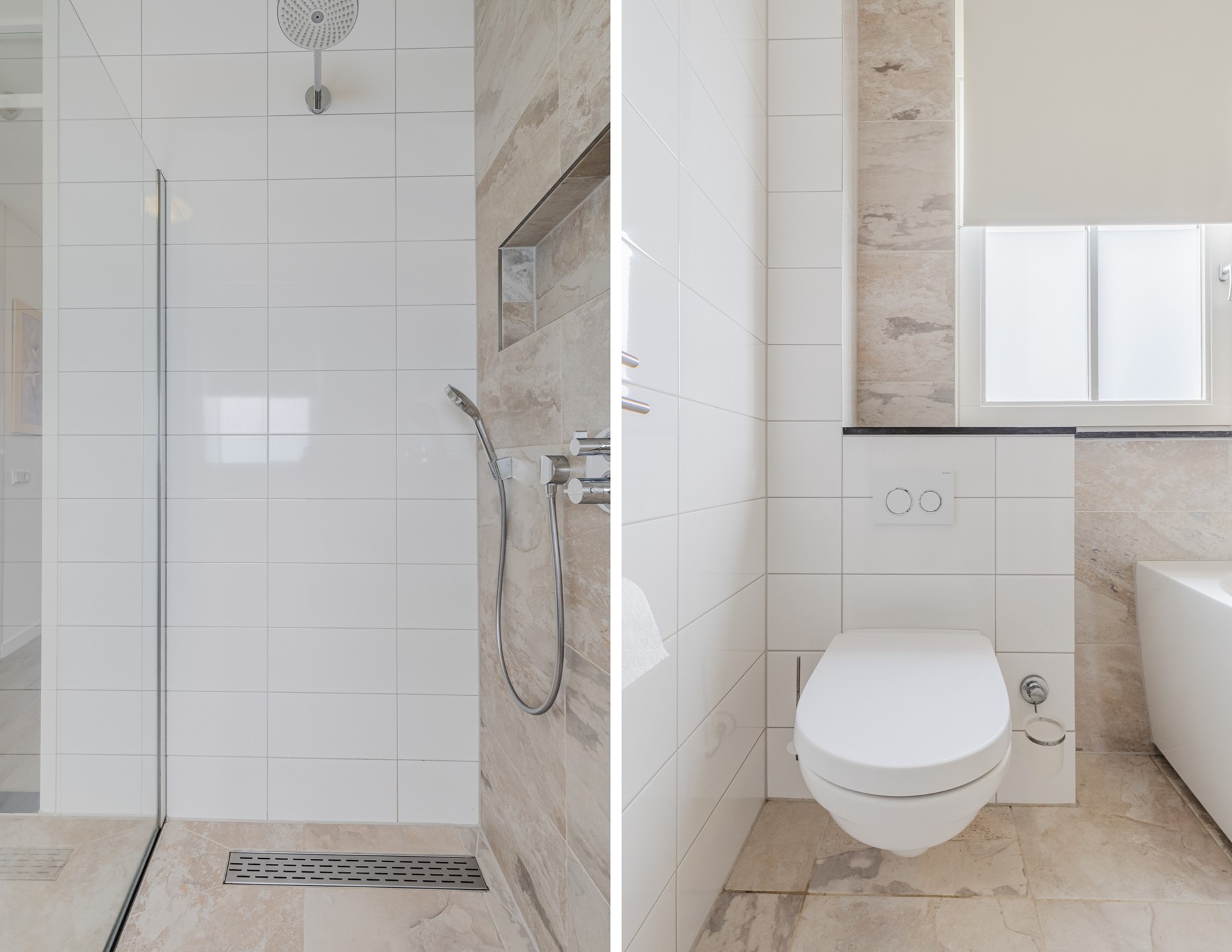 De overloop geeft toegang tot 2 grote slaapkamers, de badkamer en de trapopgang naar de 2e verdieping. De overloop en de slaapkamers zijn voorzien van een pvc-vloer. De gehele verdieping is voorzien van vloerverwarming. De slaapkamers zijn ca. 10m2 en 14m2 groot. De masterbedroom is voorzien van een vaste kastenwand. De luxe, moderne badkamer (ca. 7m2) is ingericht met een ligbad, inloopdouche met regendouche, 2e toilet en een grote wastafel met meubel.