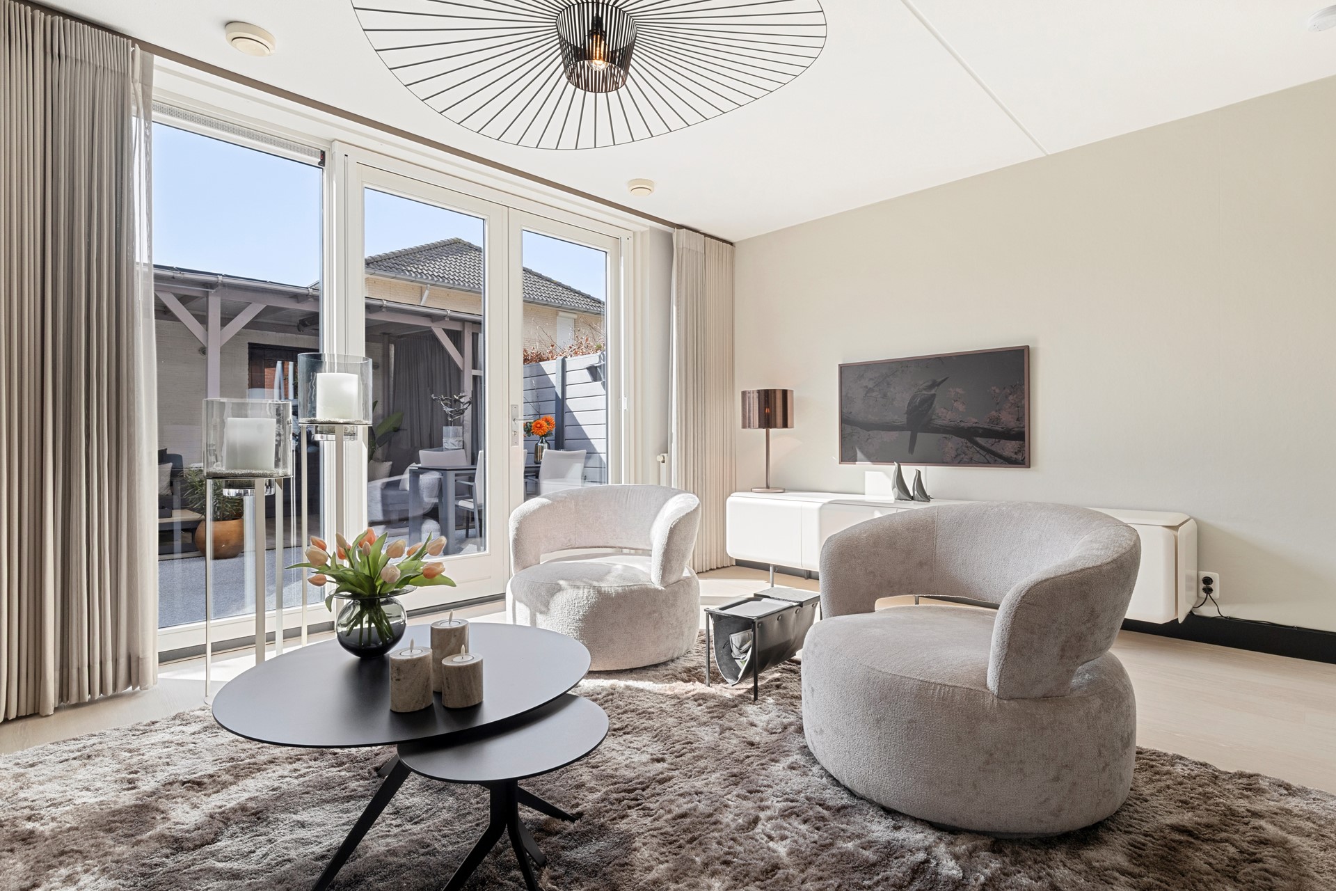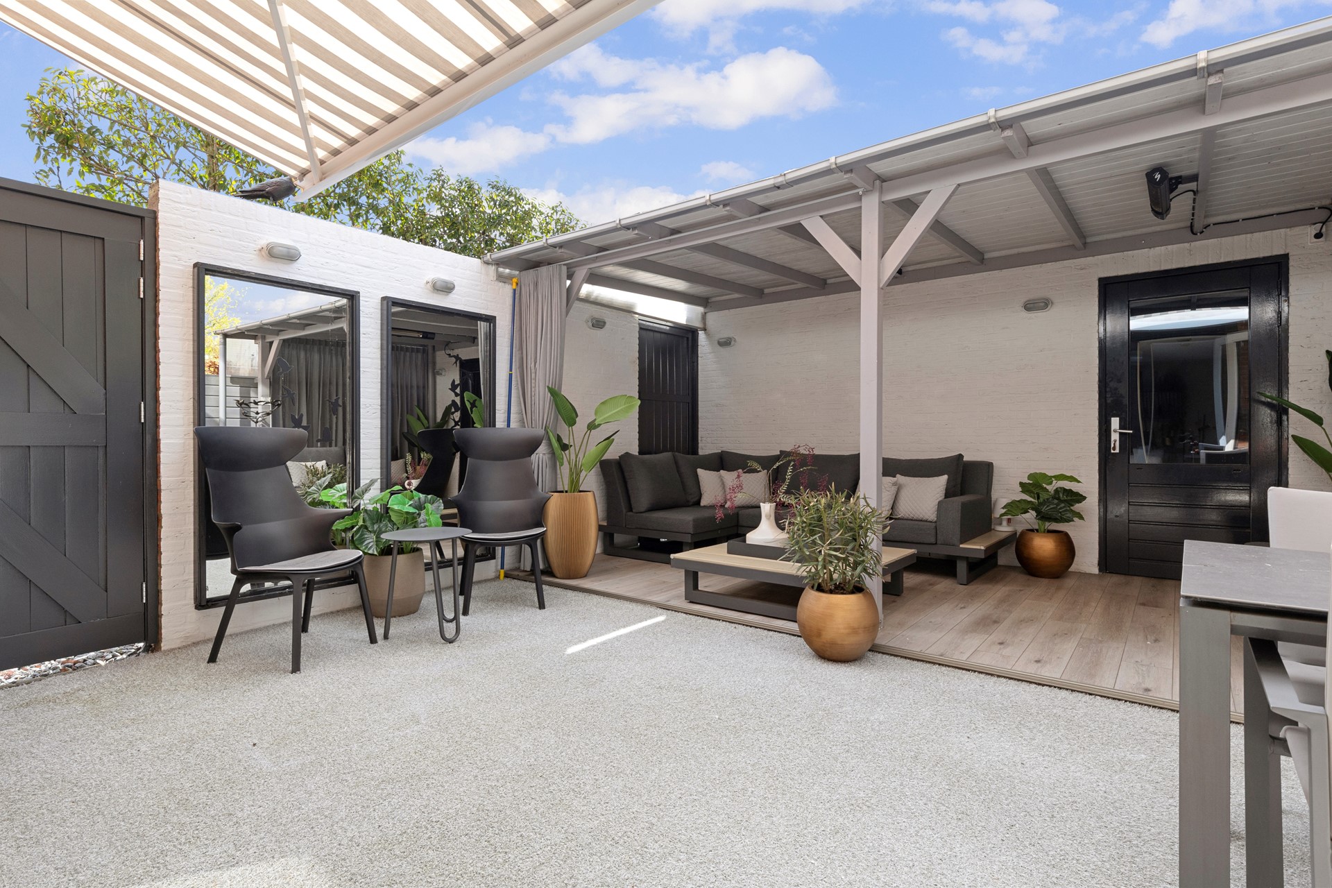 De buitenruimte is met dezelfde zorg en aandacht vormgegeven als het interieur. De zonnige patio-achtertuin, volledig vernieuwd in 2022, biedt een perfecte balans tussen comfort en onderhoudsgemak.