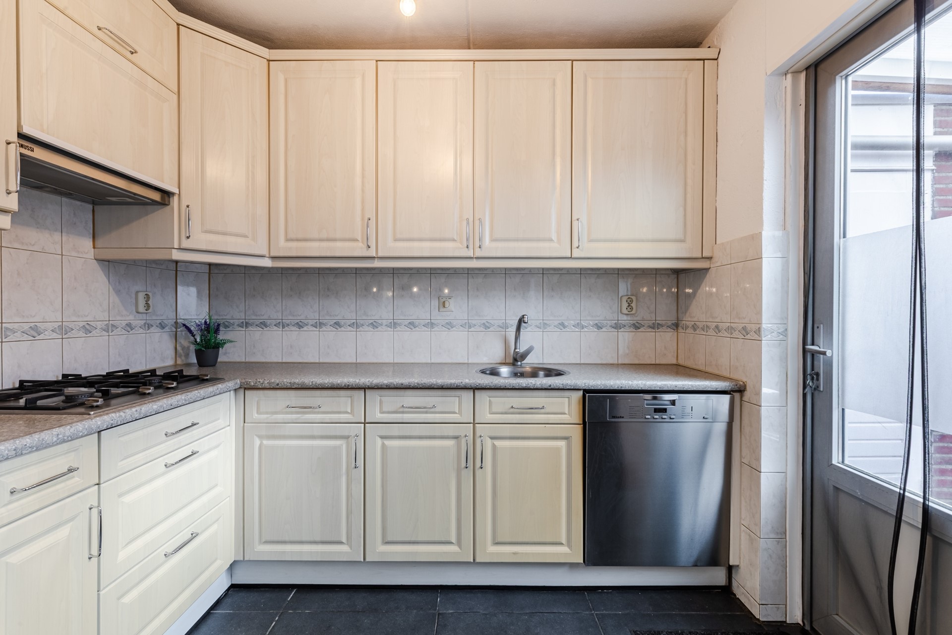 Vanuit de eigen oprit is er toegang tot de entree van de woning. De entree/ hal met garderobenis geeft toegang tot de trapopgang naar de 1e verdieping, de toiletruimte, de meterkast en de woonkamer. De deels betegelde toiletruimte is voorzien van een staand closet en fonteintje. De hal en de woonkamer zijn voorzien van blokjesparket. De woonkamer is ruim van opzet, ca. 36m2. Aan de voorzijde is er een moderne erker. Centraal in de woonkamer is er een trapkast. Aan de achterzijde zijn er openslaande tuindeuren. Door de grote raampartij is er een optimaal tuincontact. De semi-open keuken is ingericht met een 4-pitsgasfornuis, afzuigkap, combi-oven, koelkast en vaatwasser. De keuken is voorzien van een tegelvloer. Middels een loopdeur is er toegang tot het grote overdekte terras.