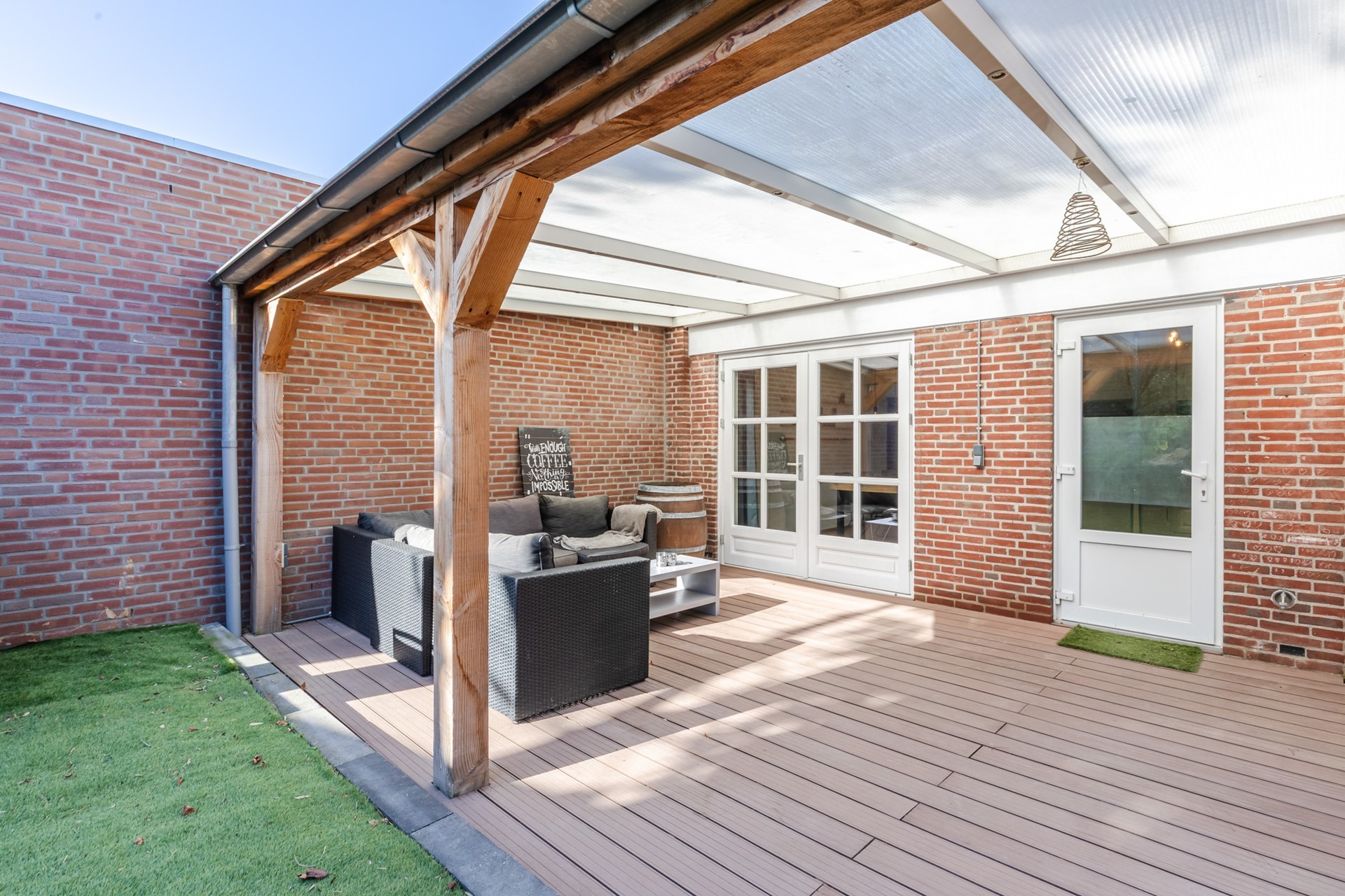 De onderhoudsvriendelijke achtertuin heeft een grote terrasoverkapping (ca. 22m2) aan de woning. Dit terras is voorzien van vlonderplanken. Vanuit dit terras is er toegang tot de garage. Verder is de tuin voorzien van een groot kunstgrasgazon en borders met beplanting. Aan de achterzijde is er geen bebouwing, dus de tuin biedt veel privacy. De tuin is gelegen op het zuidoosten.