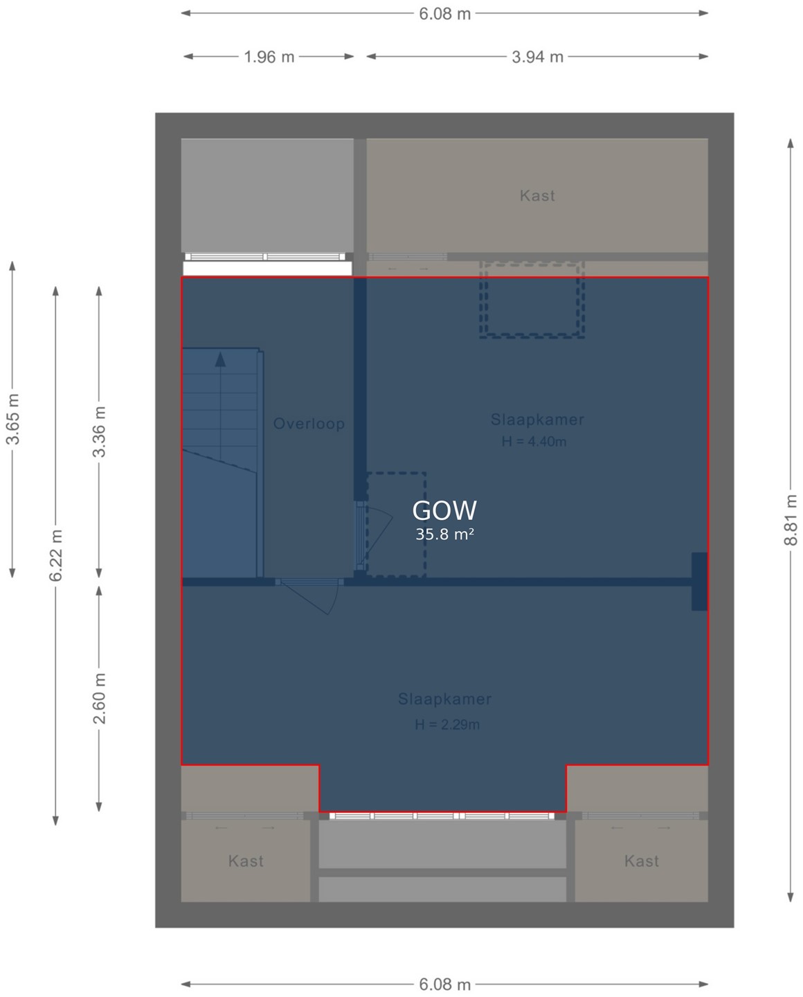 Een vaste trap geeft toegang tot de tweede verdieping. De overloop (ca.6,5m2) beschikt over een dakkapel. Op deze verdieping bevinden zich twee slaapkamers (ca.12,5 en 13m2 excl kastruimte achter de knieschotten). Eén slaapkamer heeft een toegankelijke vide en een kunststof dakvenster met zonwering. De tweede slaapkamer is voorzien van een dakkapel en bergruimte achter de knieschotten. De gehele verdieping is afgewerkt met een laminaatvloer.