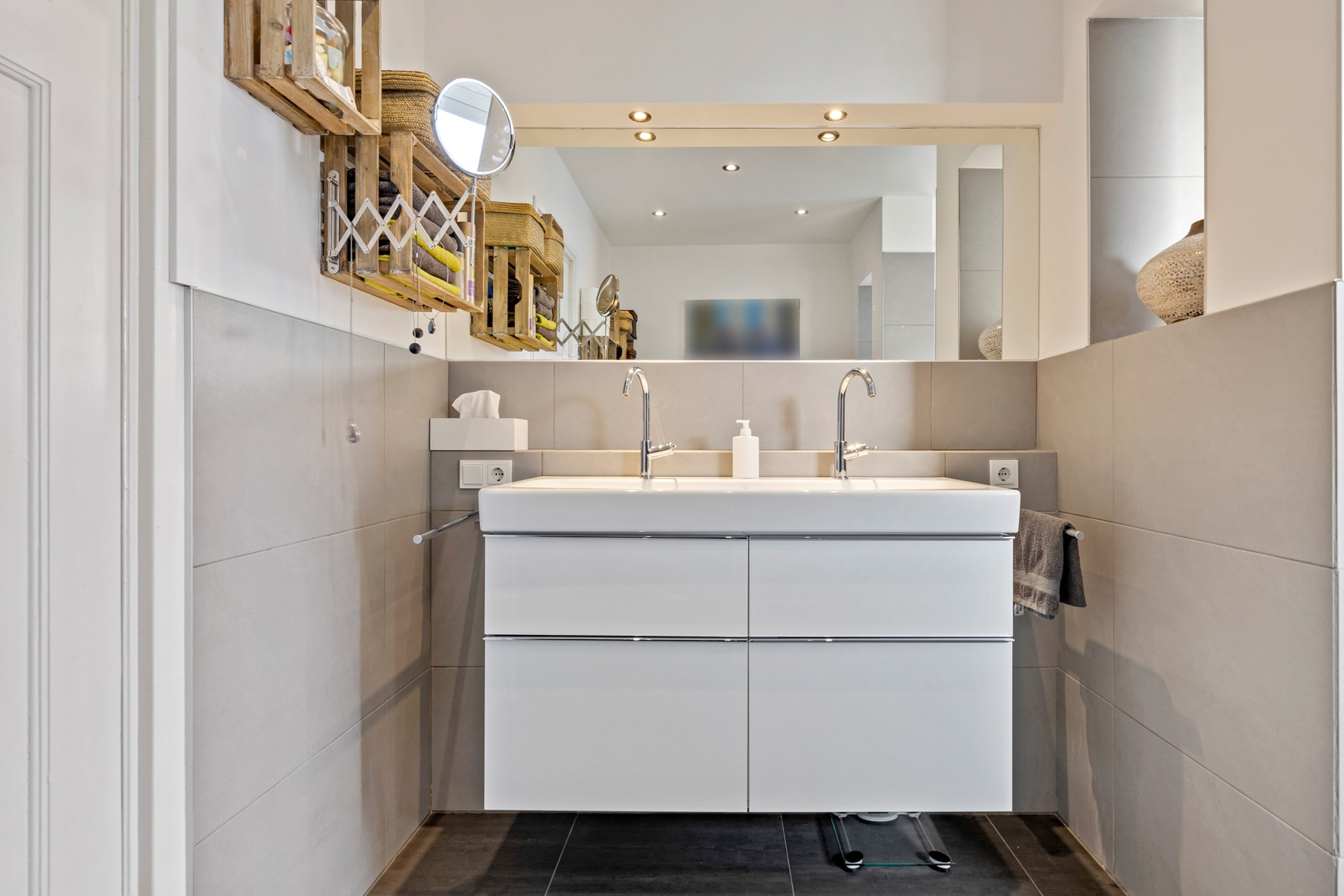 De keuken (ca.11,5m2) is ingericht met een modern keukenblok en voorzien van een inductiekookplaat met afzuigkap, koelkast en combi oven-magnetron. Daarnaast is er een vaste kastenwand met extra bergruimte. Vanuit de keuken is er zicht op het terras. Aangrenzend bevindt zich de bijkeuken (ca.8,5m2) met een loopdeur naar de tuin. In de bijkeuken zijn de aansluitingen voor wasmachine, droger en vaatwasser aanwezig. Vanuit de bijkeuken is er toegang tot de cv-ruimte en de toiletruimte. Het toilet is deels betegeld en voorzien van een staand closet, fontein en ventilatievenster.