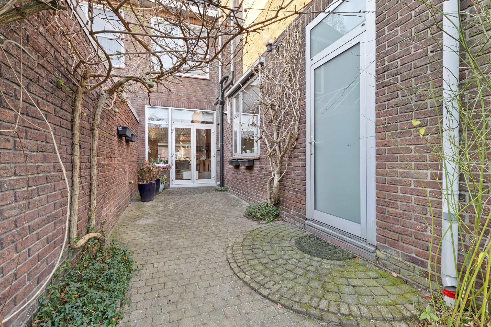 De voortuin is omheind en voorzien van een looppad naar de overdekte entree. Een grote border met beplanting maken de tuin af. De achtertuin beschikt over een terras direct aan de woning en een tweede terras met recent geplaatst prieel met in de zomer prachtige begroeiing. Verder zijn er diverse borders met beplanting. Achter in de tuin bevindt zich een houten berging met plat dak. De tuin is bereikbaar via een vrije achterom.