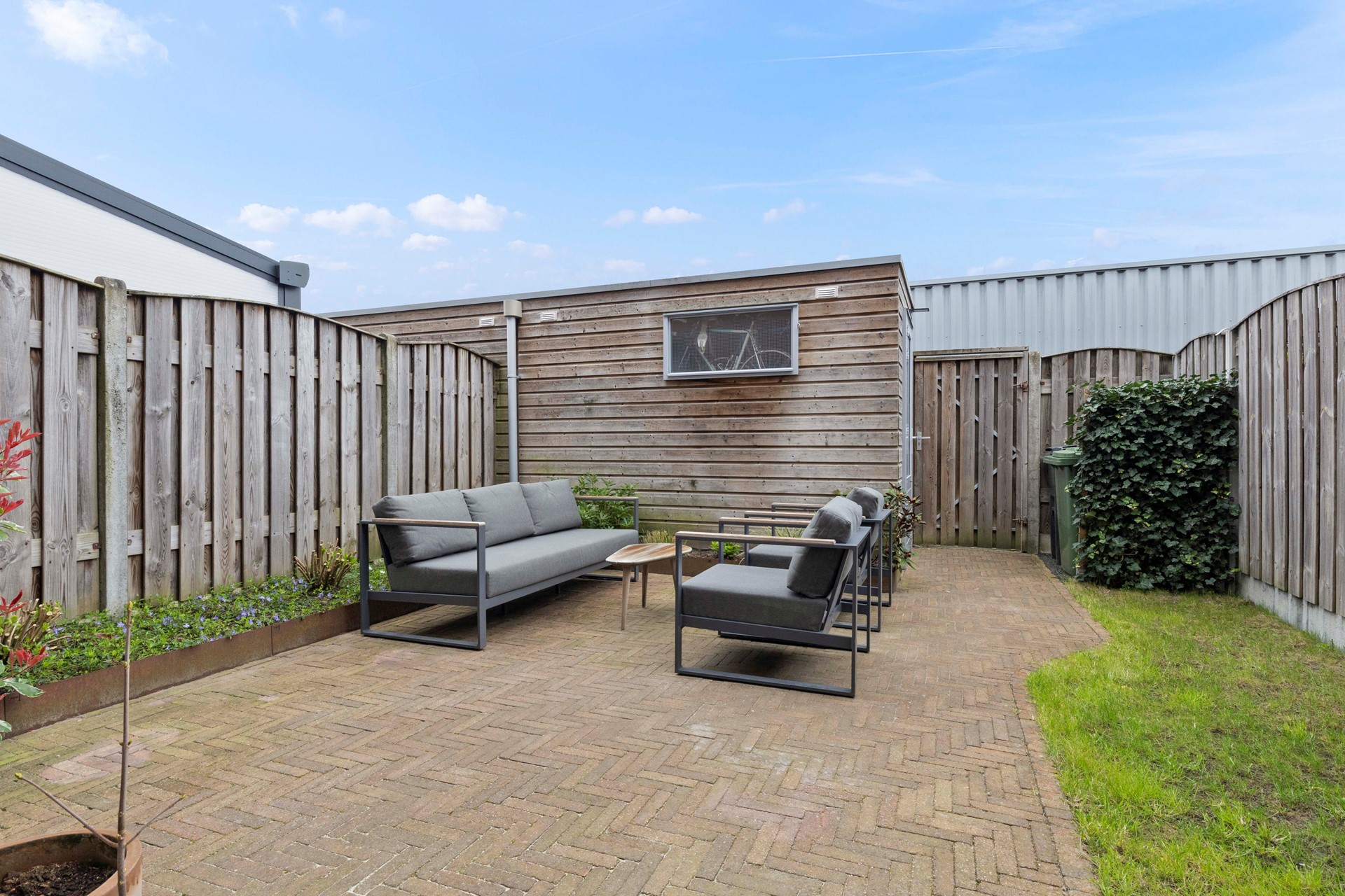 De onderhoudsvriendelijke achtertuin is aangelegd met een gazon, borders met beplanting en een beklinkerd terras. Achter een heg staan de kliko's verdekt opgesteld. Verder is er een houten berging van ca. 6,5m2. De tuin is gelegen op het westen en is te bereiken middels een vrije achterom.