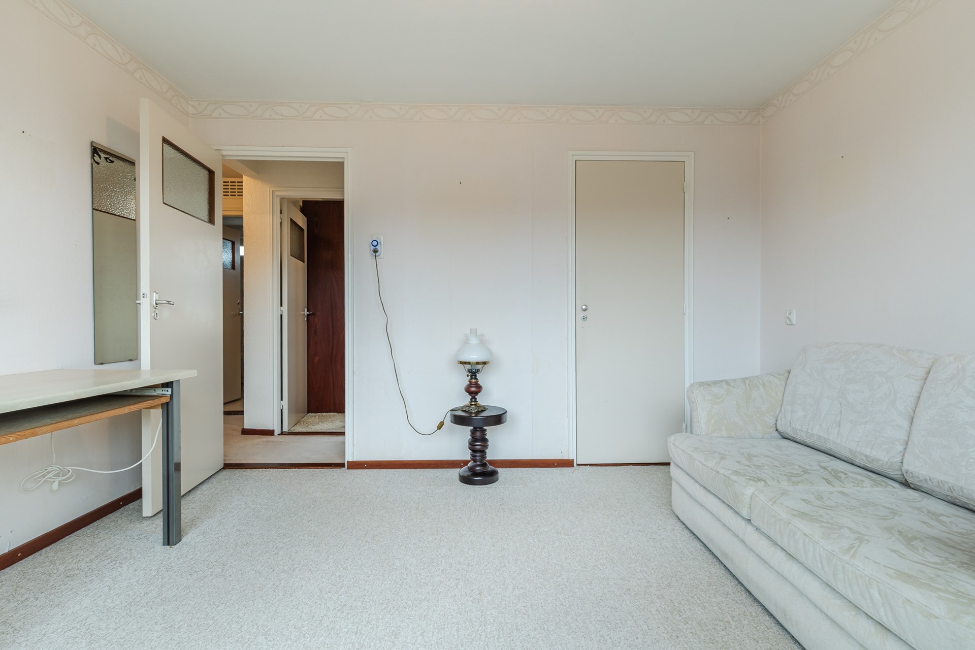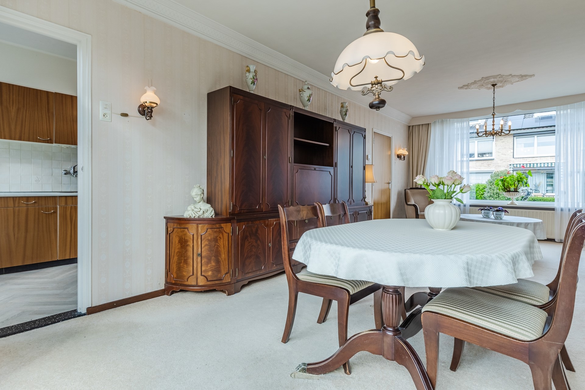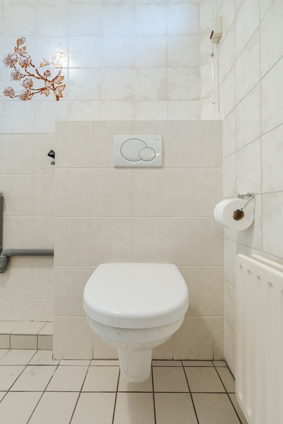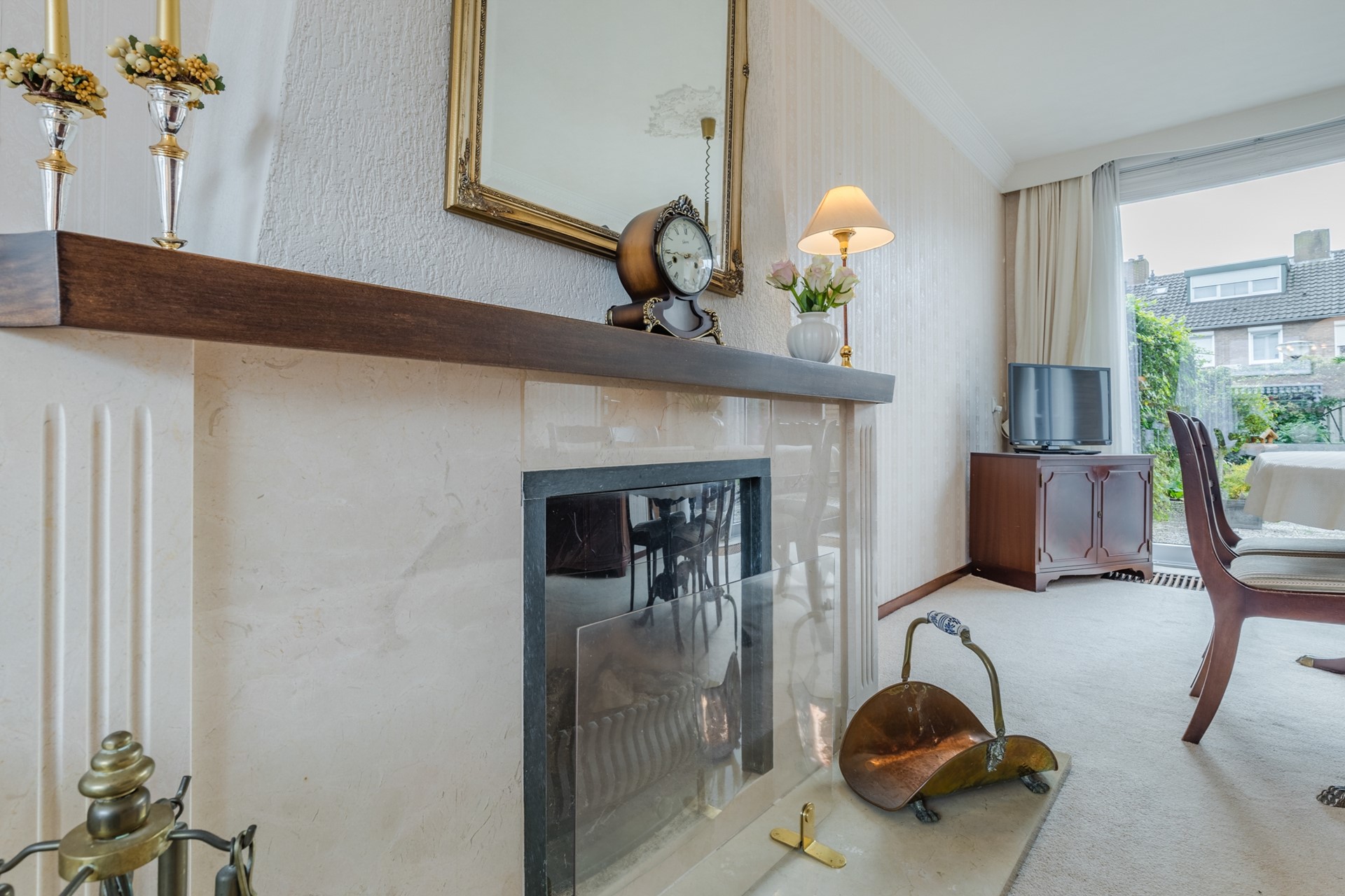De hal met garderobe geeft toegang tot de trapopgang, de toiletruimte, de woonkamer en de keuken. De deels betegelde toiletruimte heeft een staand closet, fontein en ventilatievenster. De doorzonwoonkamer (ca. 30m2) heeft veel daglichtinval mede door de grote schuifpui aan de achterzijde. De woonkamer heeft een gashaard met een mooie marmeren schouwmantel. Door de ruime voortuin is er in de zithoek voldoende privacy.