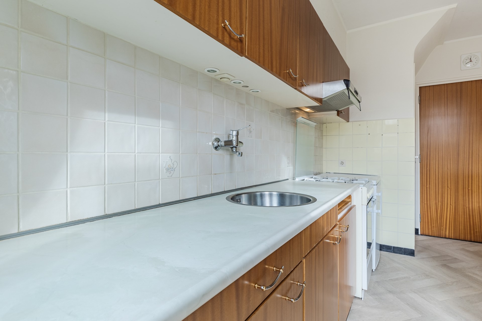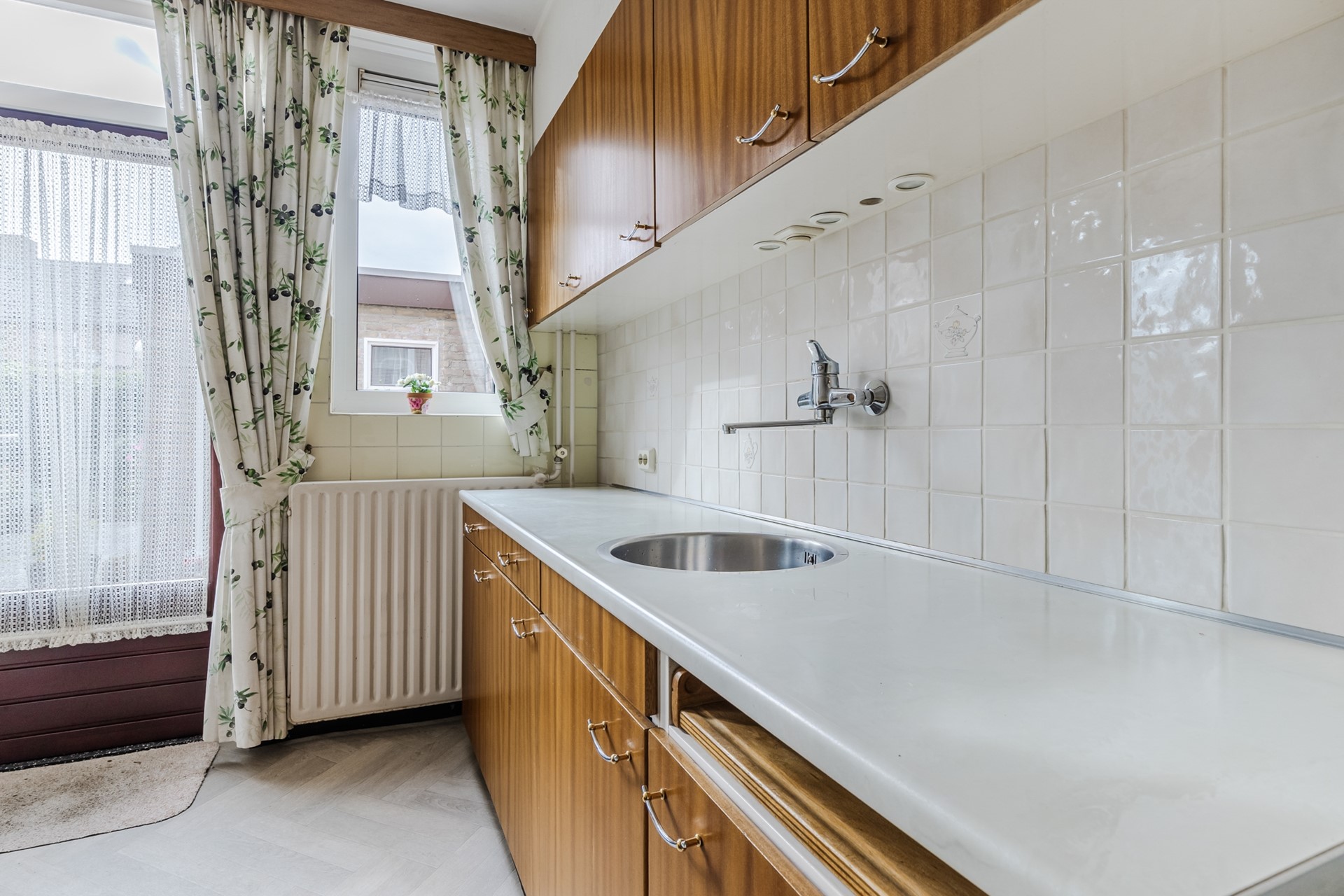 Via de woonkamer is er toegang tot de afgesloten leefkeuken, De keuken (ca. 10m2) is ingericht met een eenvoudig maar keurig keukenblok voorzien van veel opbergruimte en een losstaand 4 pits gasfornuis met oven en afzuigkap en een tafelmodel koelkast. Een loopdeur in de keuken geeft toegang tot de tuin. In de woonkamer en hal ligt vloerbedekking, in de keuken ligt een Novilon visgraatvloer.