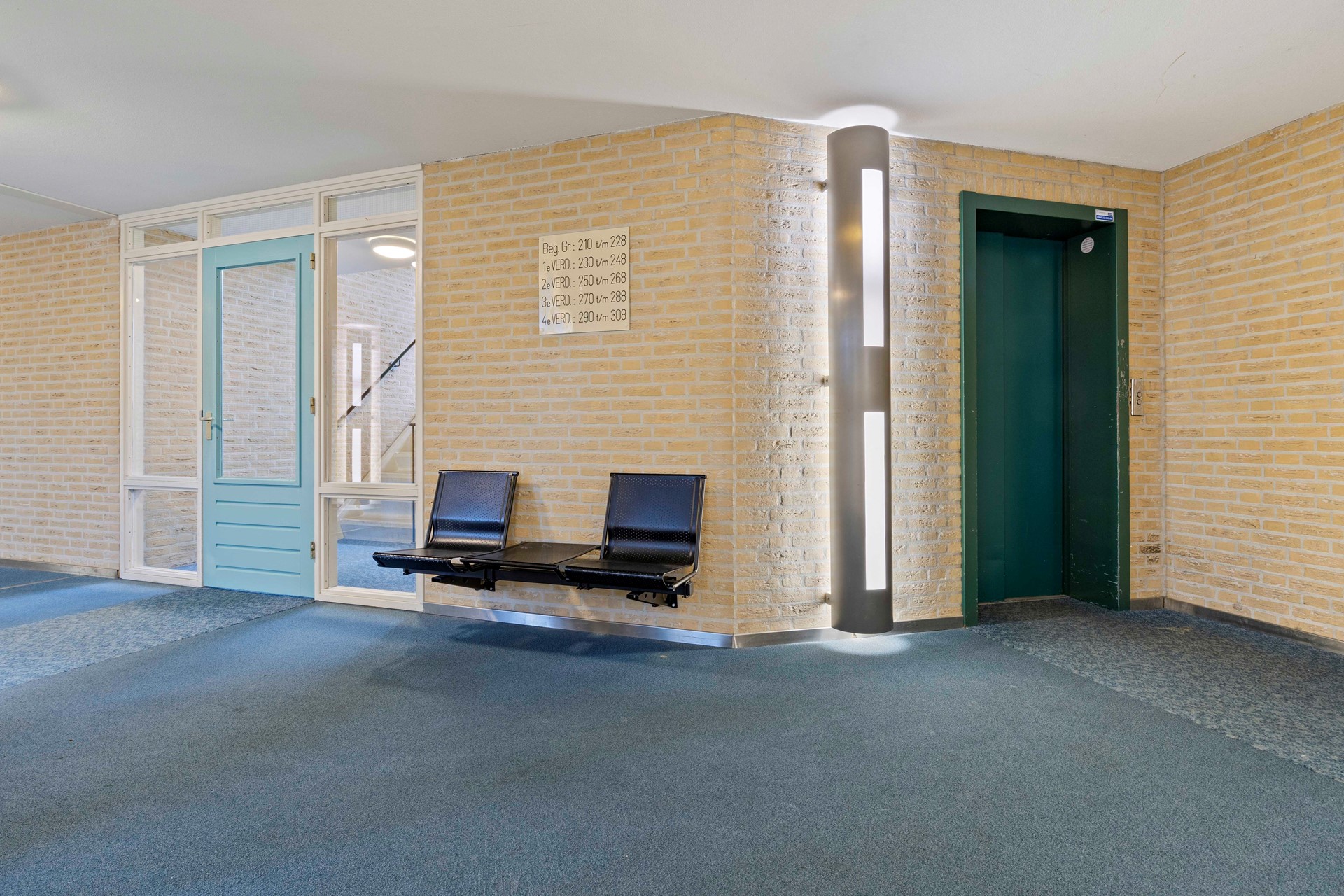 Centrale entree met brievenbussentableau en videofooninstallatie. De ontvangsthal geeft toegang tot het trappenhuis, de liftinstallatie en het achtergelegen, afgesloten parkeerterrein.