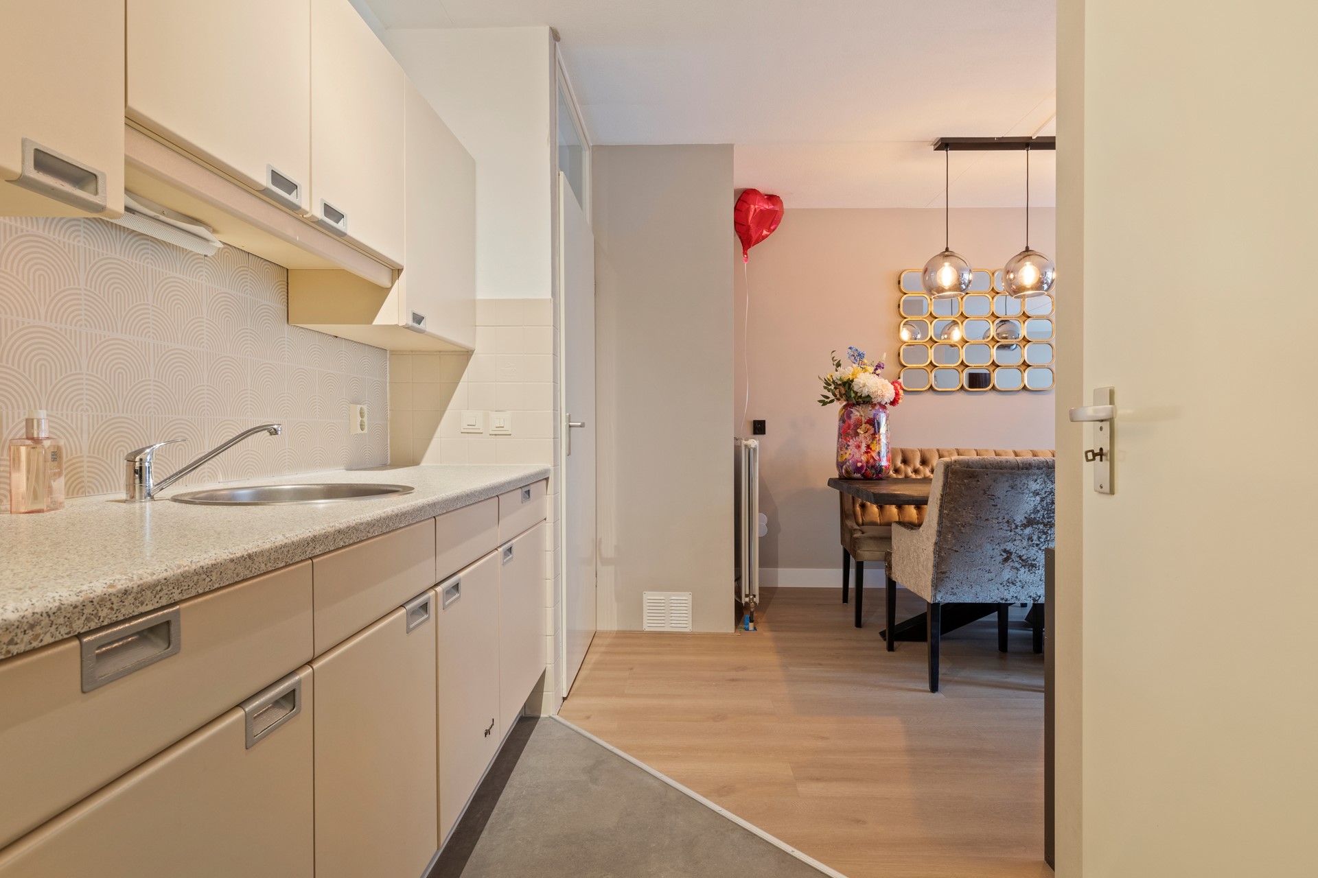 De lichte woonkamer met open keuken (ca. 31m2) is voorzien van een nieuwe, grote raampartij (2025) over de volledige breedte, inclusief loopdeur naar het balkon. Dit zorgt voor een fijne lichtinval en een ruimtelijk gevoel.