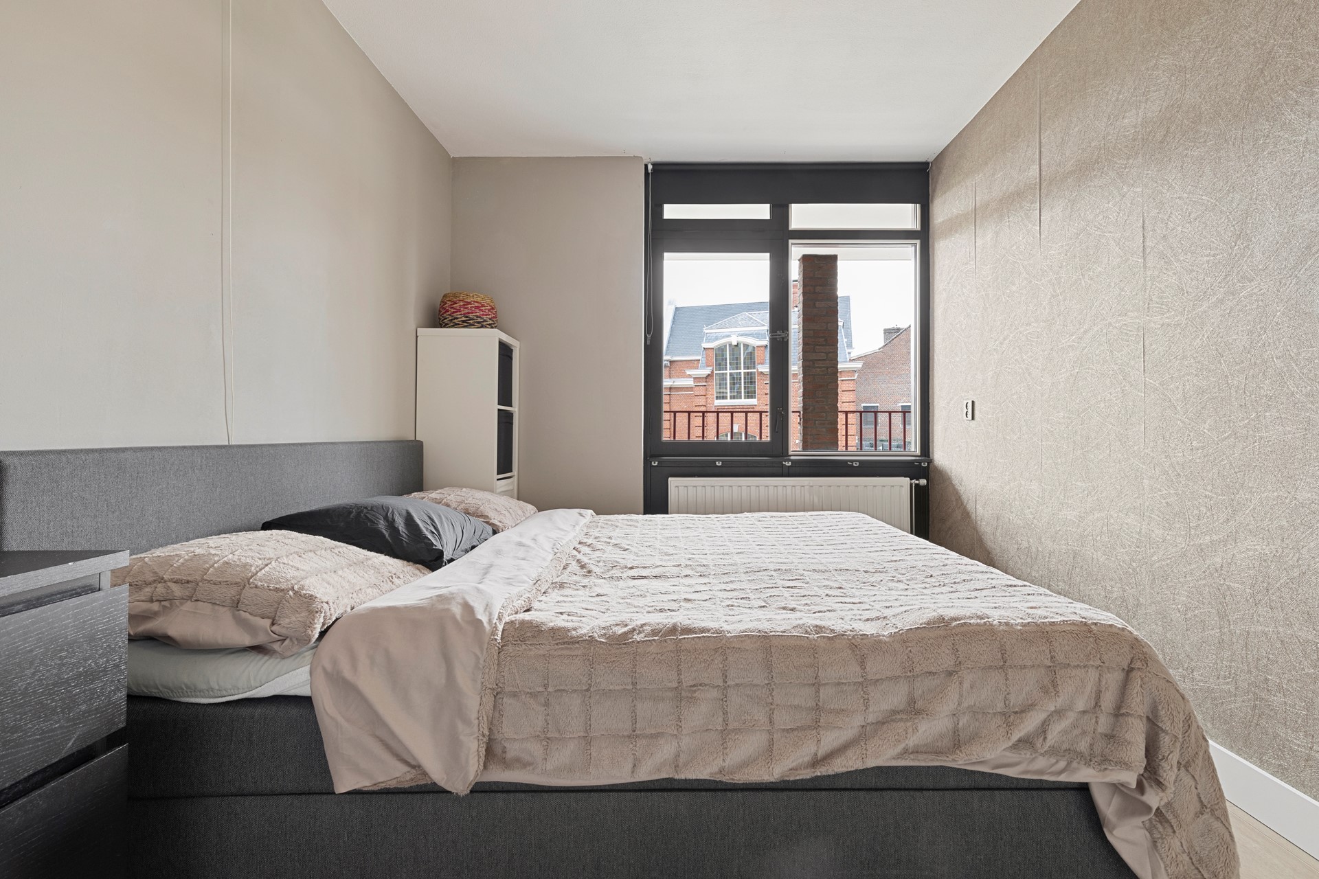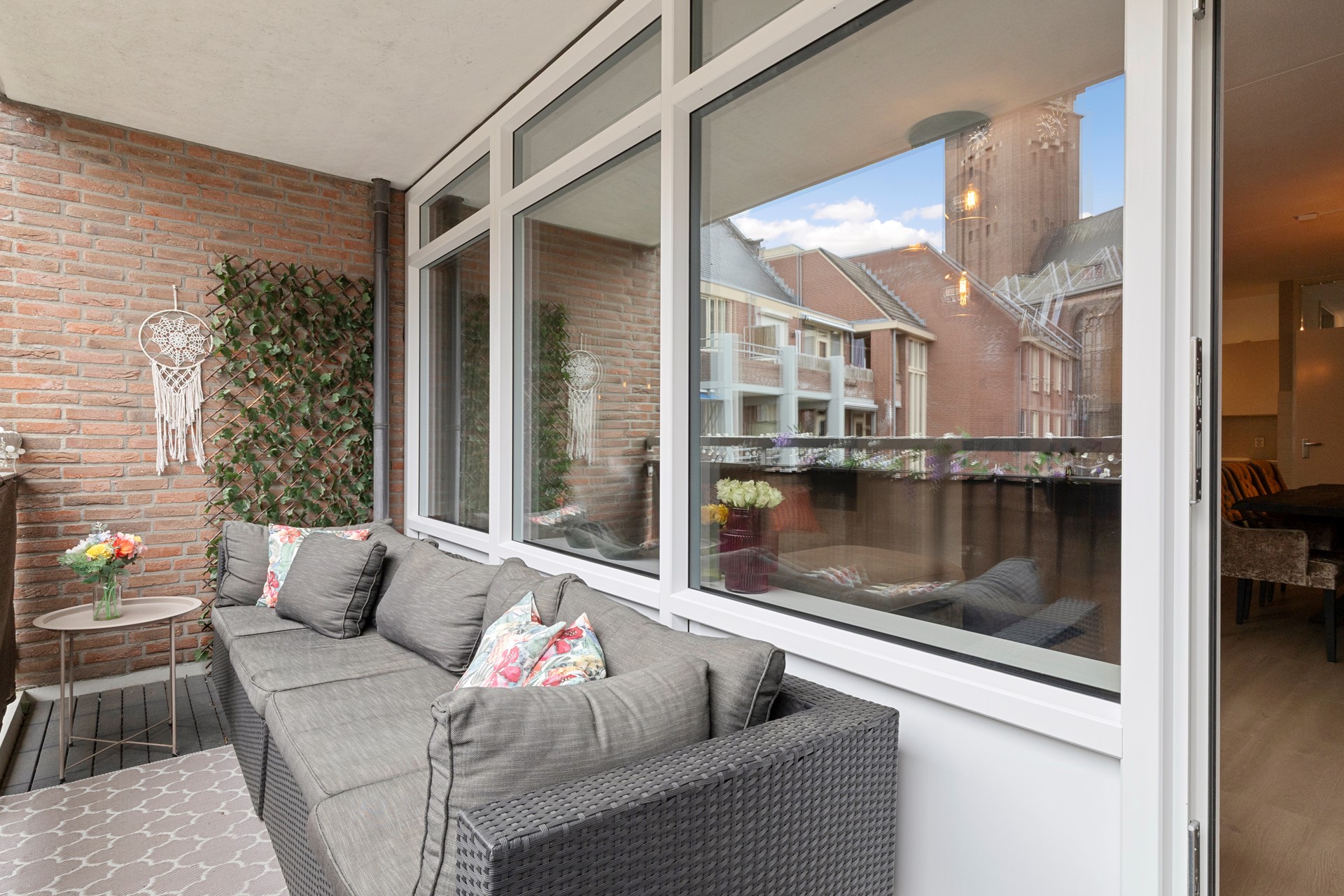 Het ruime balkon (ca.7m2) is gelegen aan de rustige achterzijde van het complex en biedt verrassend veel privacy, ondanks de centrale ligging. Vanaf hier geniet je van een mooi uitzicht op de Sint-Martinuskerk. Het balkon is in 2023 vernieuwd met een stijlvolle vlondervloer.