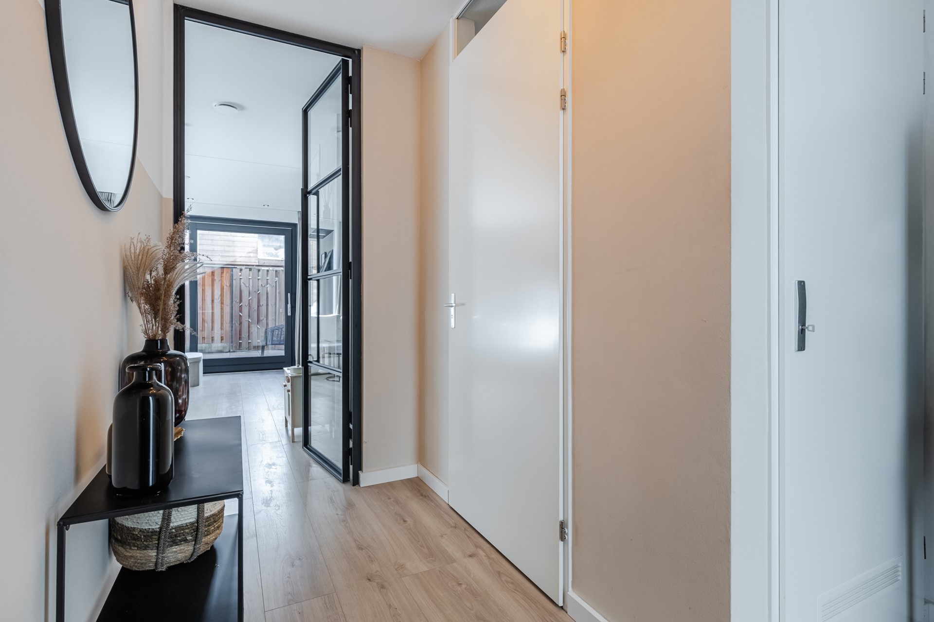 De entree/ hal geeft toegang tot de meterkast, de toiletruimte en de woonkamer. De toiletruimte is voorzien van een zwevend closet en fonteintje. Middels een stalen deur is er toegang tot de woonkamer. De woonkamer met inbouwspots is ruim en praktisch van opzet, ca. m2. Aan de voorzijde is de open keuken gesitueerd. De moderne keuken is voorzien van een inductiekookplaat, afzuigkap, vaatwasser, koelkast en een combi-oven. Aan de achterzijde is er een grote schuifpui welke toegang geeft tot de tuin. Verder heeft de woonkamer een handige trapkast voor extra bergruimte. De gehele begane grond is voorzien van een lichte laminaatvloer met vloerverwarming.