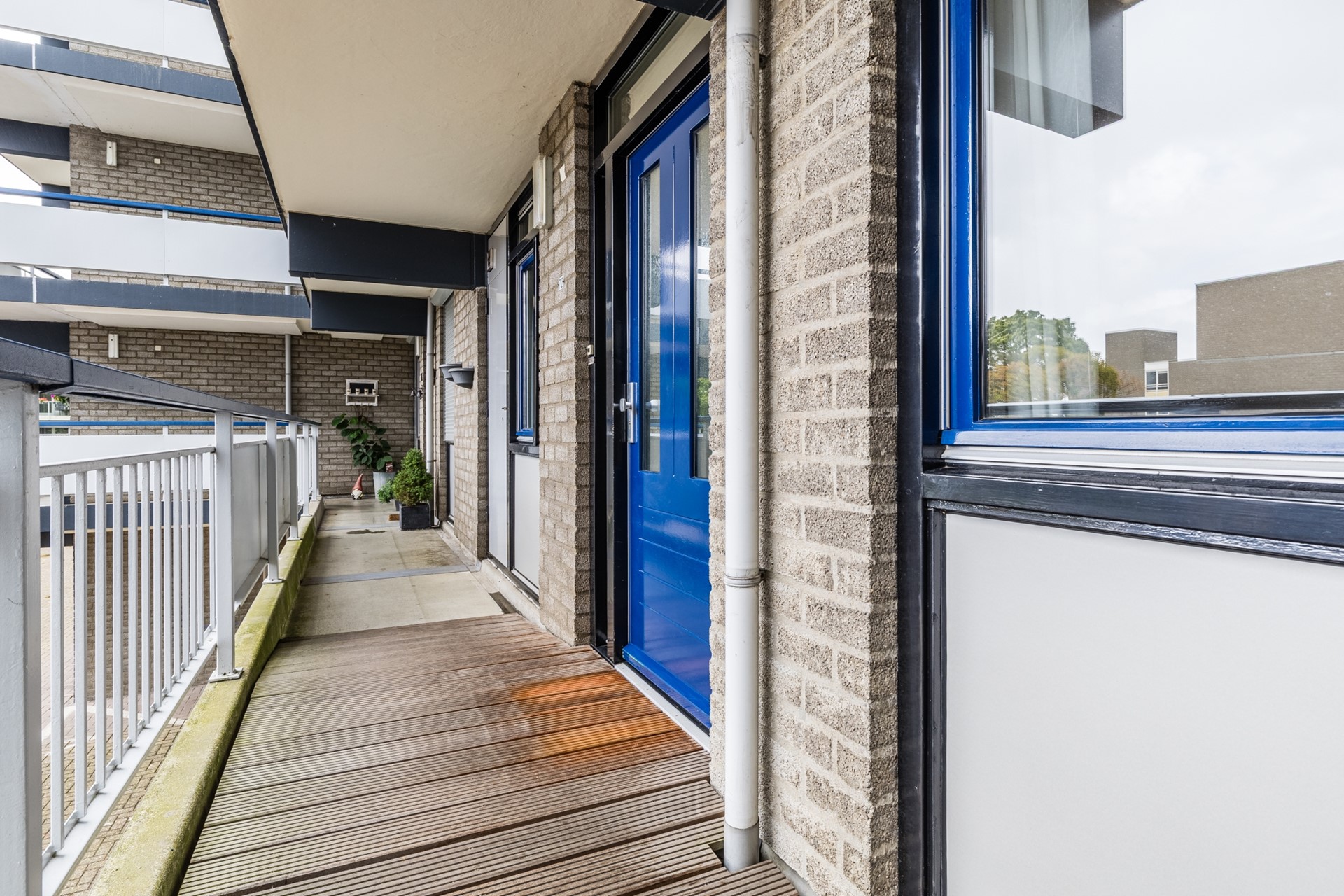 De galerij op de verdieping is rolstoelvriendelijk en geeft toegang tot de appartementen. Via de entree komt men in een voorportaal. Een deur met glas in-lood geeft toegang tot de ruime woonkamer. De praktisch in te richten woonkamer (ca. 31m2) geeft toegang tot een zonnig balkon over de gehele breedte van het appartement. Het balkon (ca. 5m2) heeft een glazen balustrade. Vanuit de woonkamer is er toegang tot de leefkeuken (ca. 7m2) ingericht met een keurig keukenblok met 4 pits gasfornuis, afzuigkap, spoelbak en mengkraan. Vanuit de keuken is er zicht op de galerij en de parkeerplaatsen aan de achterzijde. Grenzend aan de keuken bevindt zich de bijkeuken (ca. 2m2) met aansluitingen voor de wasmachine en drogere en extra opbergruimte voor de proviand.