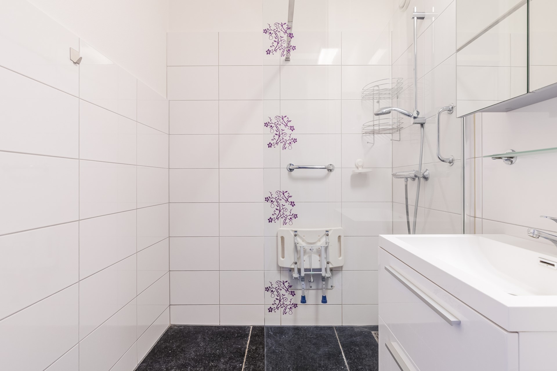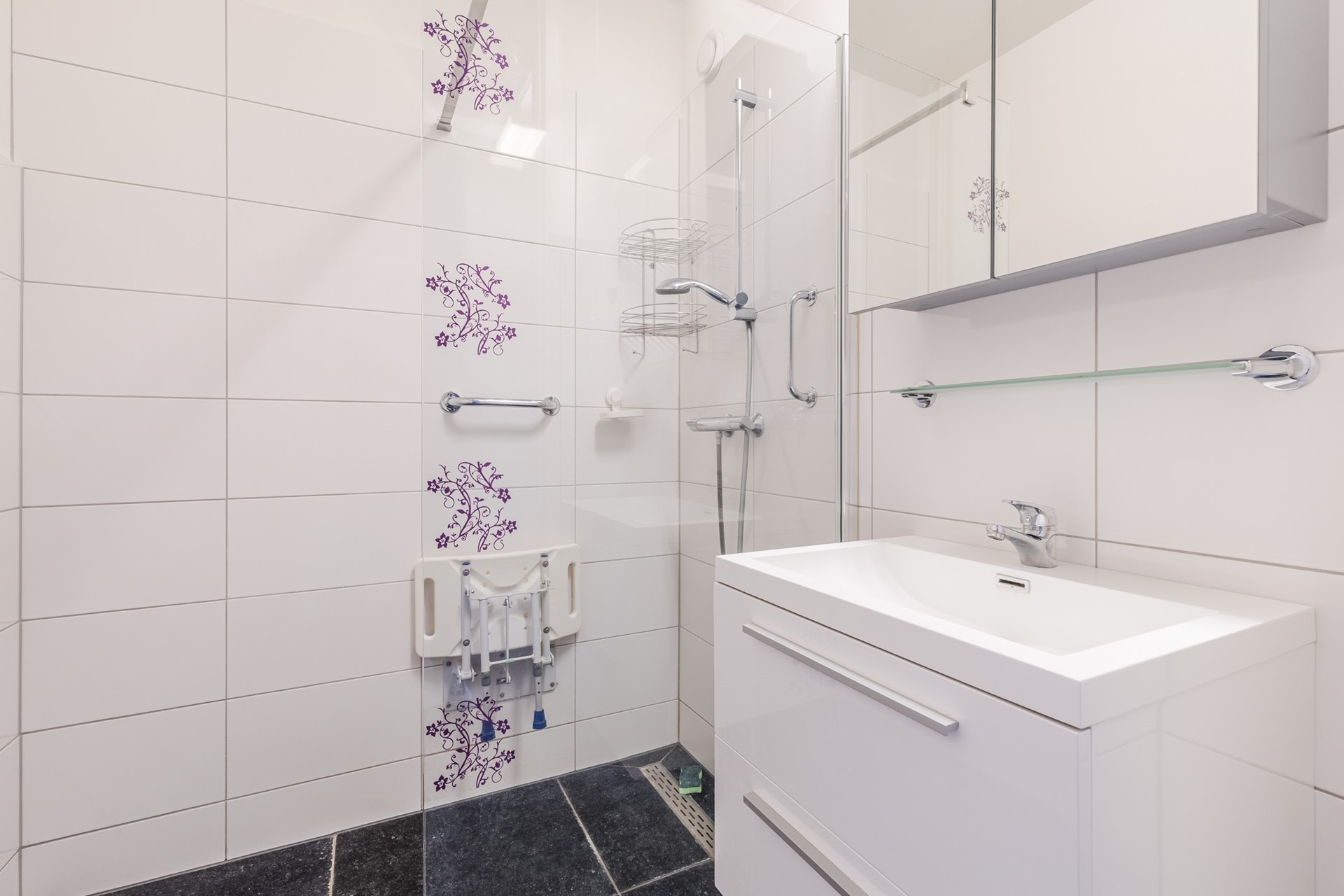 Vanuit de woonkamer is er toegang tot de overloop met 2 slaapkamers, toiletruimte en de badkamer. De deels betegelde toiletruimte heeft een staand closet, fontein en mechanische afzuiging. De grotendeels betegelde badkamer (ca. 3m2) heeft een ruime inloopdouche met thermostaatkraan en een wastafel met ladenkast en spiegelkast.