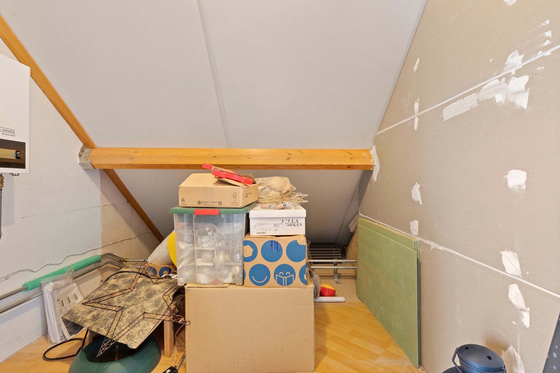 Via een vaste trap is de zolderverdieping bereikbaar. Op de overloop (ca. 6,5m2) bevinden zich de omvormer voor de zonnepanelen, de mechanische ventilatie-unit en extra aansluitingen voor wasapparatuur. In een aparte bergruimte (ca. 2,5m2) zijn de cv-ketel (Remeha, 2017) en de hybride warmtepomp (2023) geplaatst.