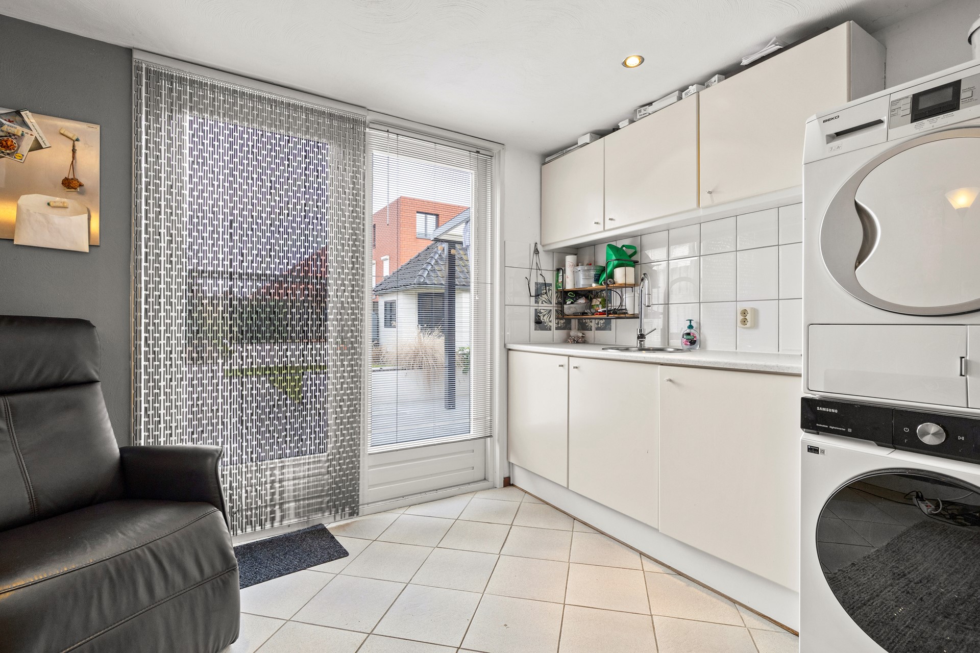 Via een portaal met inbouwkast is de voormalige garage bereikbaar. Deze is opgesplitst in een praktische berging voor fietsen en tuingereedschap (ca. 6m2) met dubbele deuren naar de oprit, en een volledig geïsoleerde en afgewerkte multifunctionele ruimte. Deze ruimte (ca. 16m2) beschikt over openslaande tuindeuren, een pantry met wateraansluiting en kastruimte, aansluitingen voor wasmachine en droger en inbouwspots. Ideaal als praktijkruimte, kantoor aan huis of hobbyruimte.