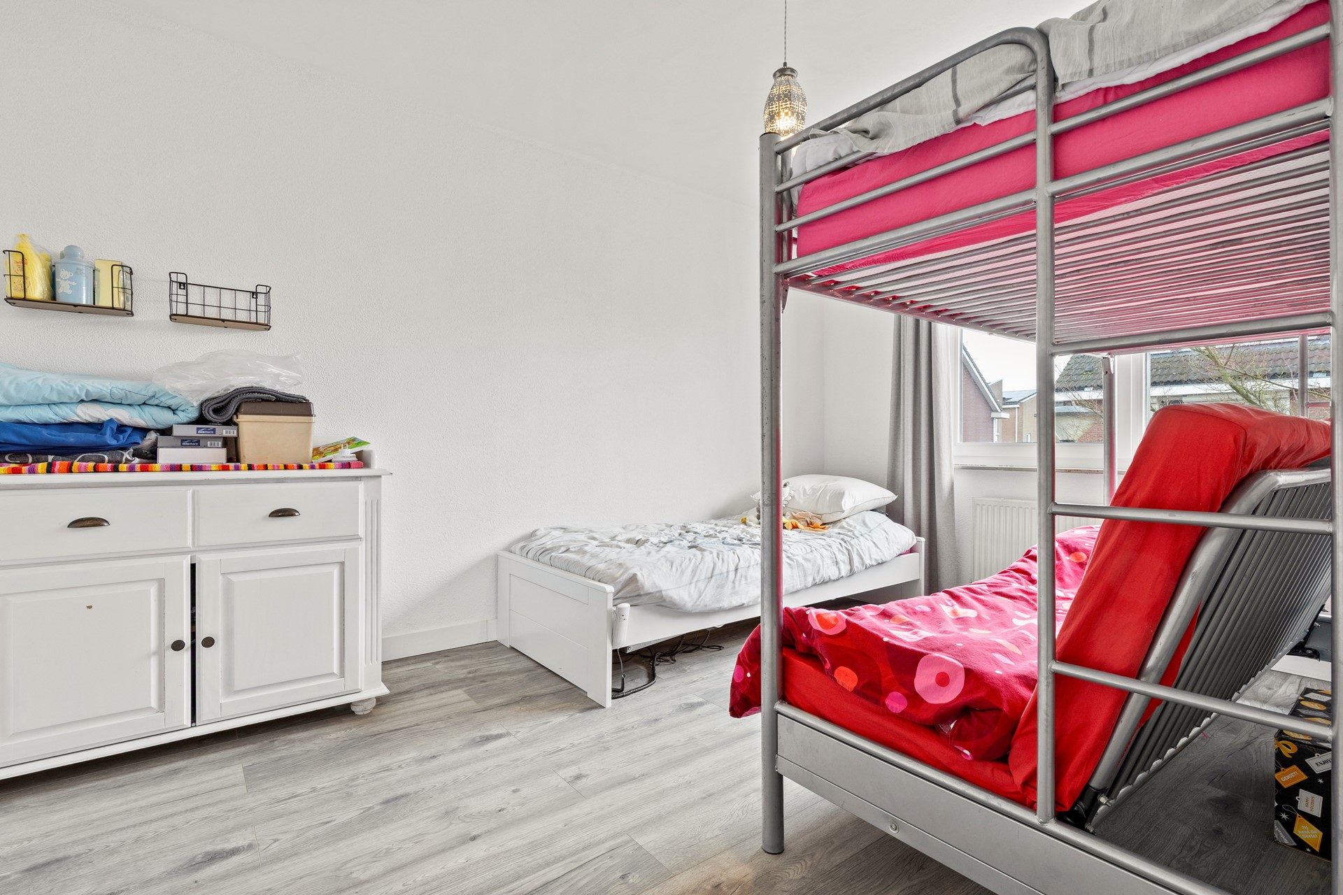 De ruime vierde slaapkamer (ca. 15m2) is voorzien van dakramen aan beide zijden en praktische bergruimte achter de knieschotten. Deze kamer is desgewenst op te splitsen in twee kamers. De gehele verdieping is afgewerkt met een lichte laminaatvloer.