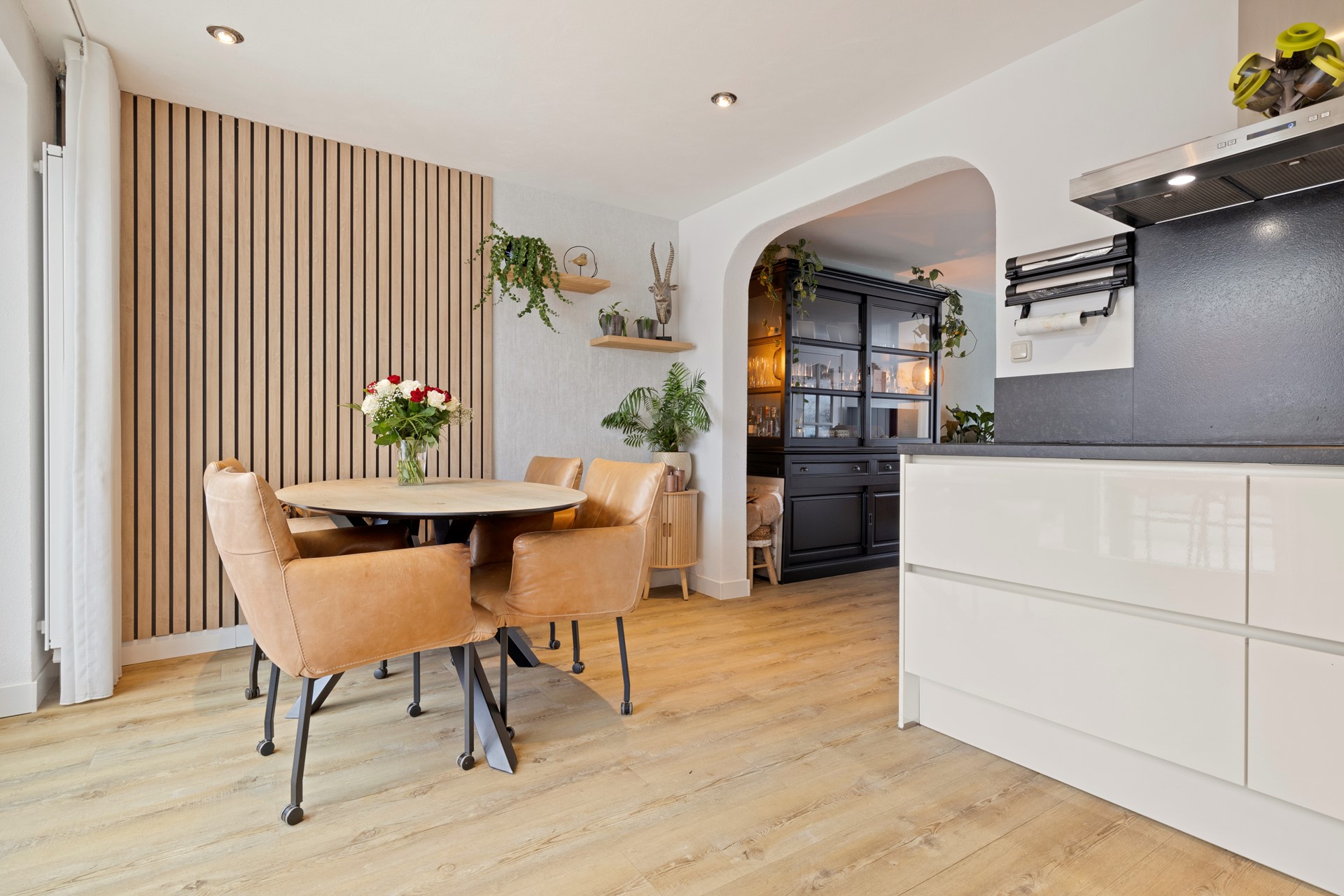 De woonkamer is ruim opgezet (ca. 27m2) met een gezellige zithoek aan de voorzijde en uitzicht op de voortuin. Een airco-unit zorgt hier voor zowel verkoeling als verwarming en het venster is voorzien van een zonnescreen. Aan de achterzijde is de woning over de volledige breedte uitgebouwd, wat resulteert in een royale leefkeuken (ca. 17m2) met veel lichtinval. Grote schuifpuien en een loopdeur verbinden binnen moeiteloos met het overdekte terras.